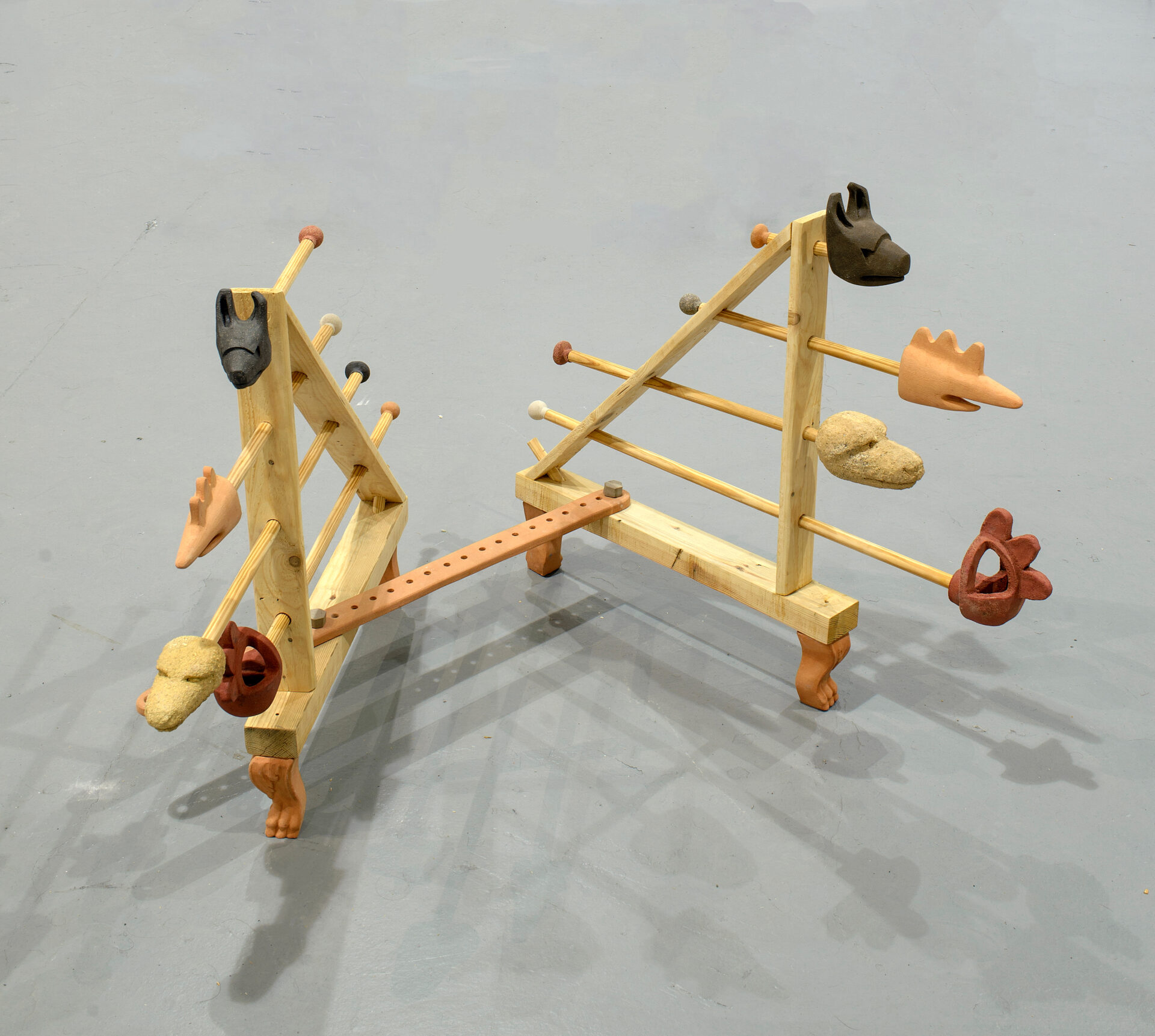 Τα ξύλινα έργα της Αλίκης Παπαδημήτριου έρχονται από τον παλαιό κόσμο των χειροποίητων παιχνιδιών. Όμως, οι απολήξεις τους είναι ζωόμορφες κεφαλές που παραπέμπουν στα σκοτεινά γοτθικά τέρατα.