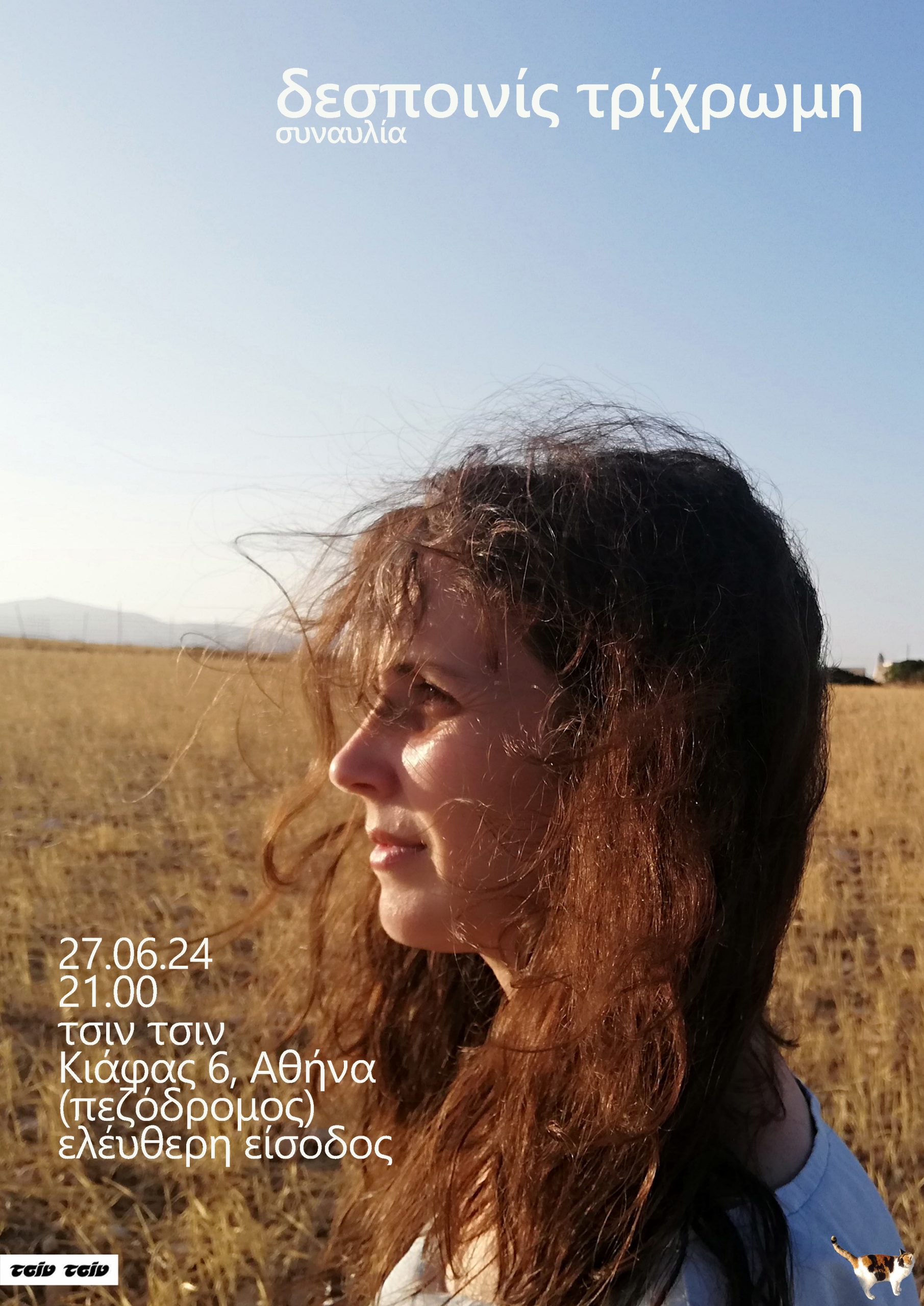 Στις 27 Ιουνίου η Δεσποινίς Τρίχρωμη θα βρεθεί στον πεζόδρομο του Τσιν Τσιν, για το μοναδικό live που θα κάνει στην Αθήνα για αυτό το καλοκαίρι, όπου θα παίξει μια επιλογή από κομμάτια της, από τα παλιά παλιά μέχρι τα καινούργια καινούργια.