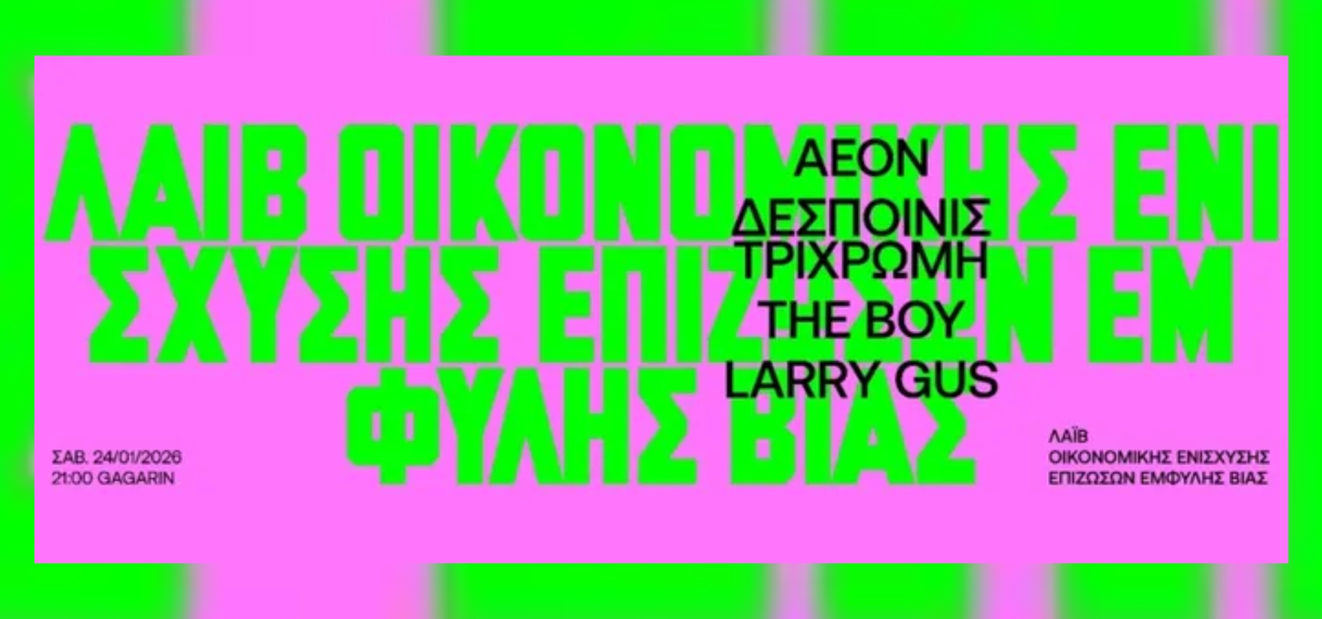 Το Σάββατο 24 Ιανουαρίου στο Gagarin 205 διοργανώνεται μία συναυλία για την οικονομική ενίσχυση επιζωσών έμφυλης βίας που κατήγγειλαν τον κακοποιητή τους.