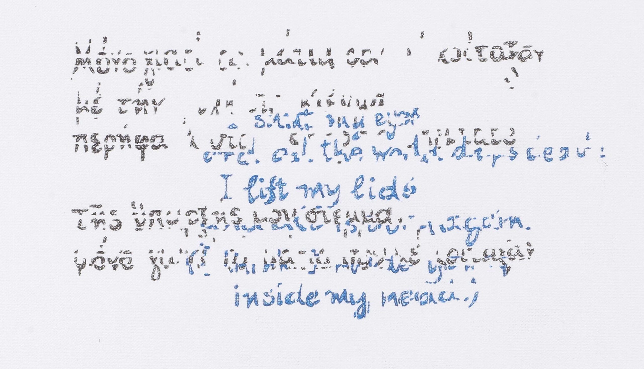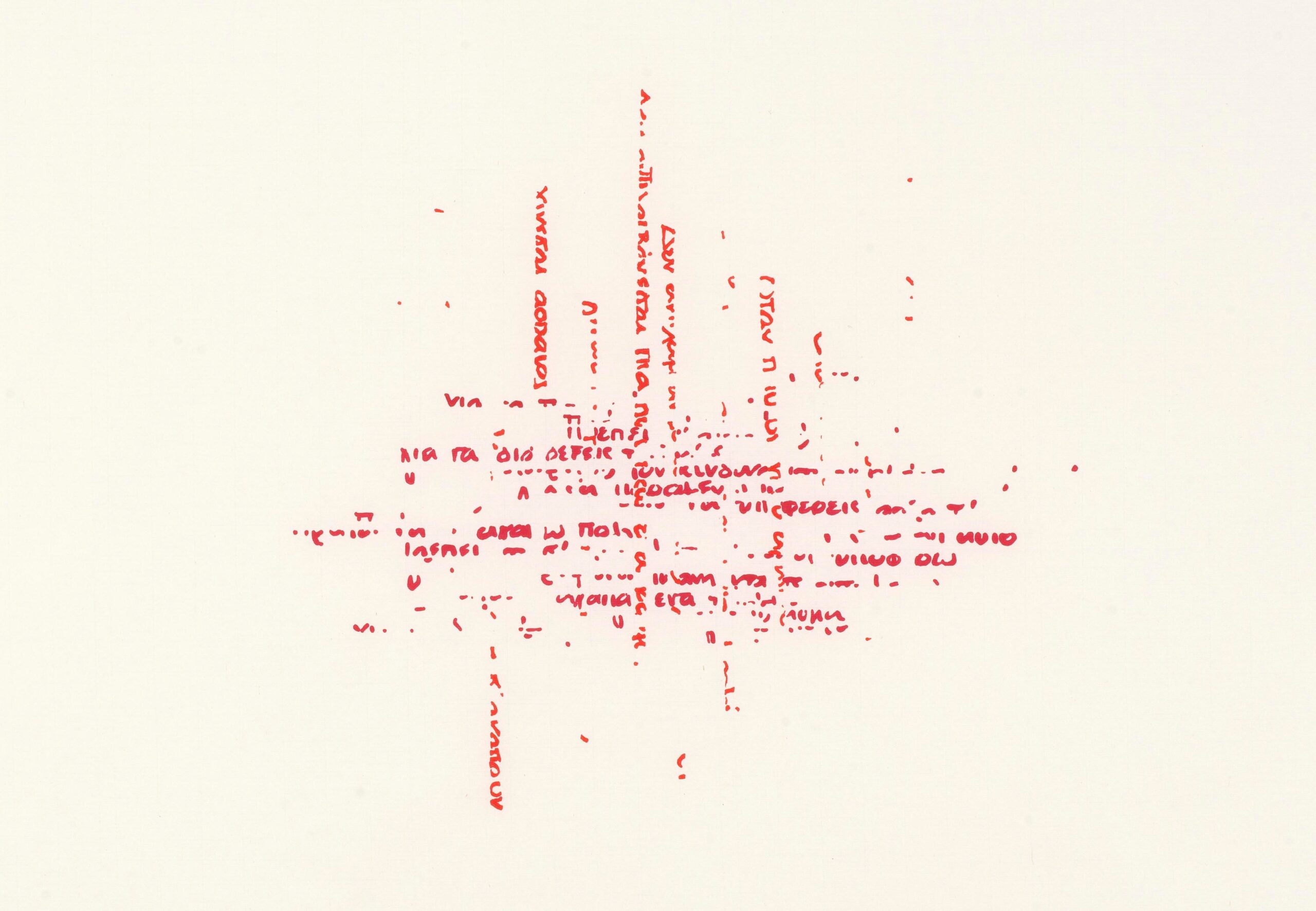 Το αποκύημα αυτής της επεξεργασίας αποτυπώνεται επάνω σε ανάγλυφα χαρτιά ελαιογραφίας, σε ρυζόχαρτα, και σε γιαπωνέζικα χειροποίητα χαρτιά, με μπλε, μαύρο και κόκκινο αρχειακό μαρκαδόρο. Η αποτύπωση της πλέξης, της χειρωναξίας, δημιουργεί μια νέα πλοκή- μια νέα αφήγηση, ενώ τα ίδια τα υλικά στα οποία αποτυπώνεται το αποτέλεσμα της διαδικασίας αυτής, συνδέουν περαιτέρω την πράξη της γραφής με αυτή του εργόχειρου.