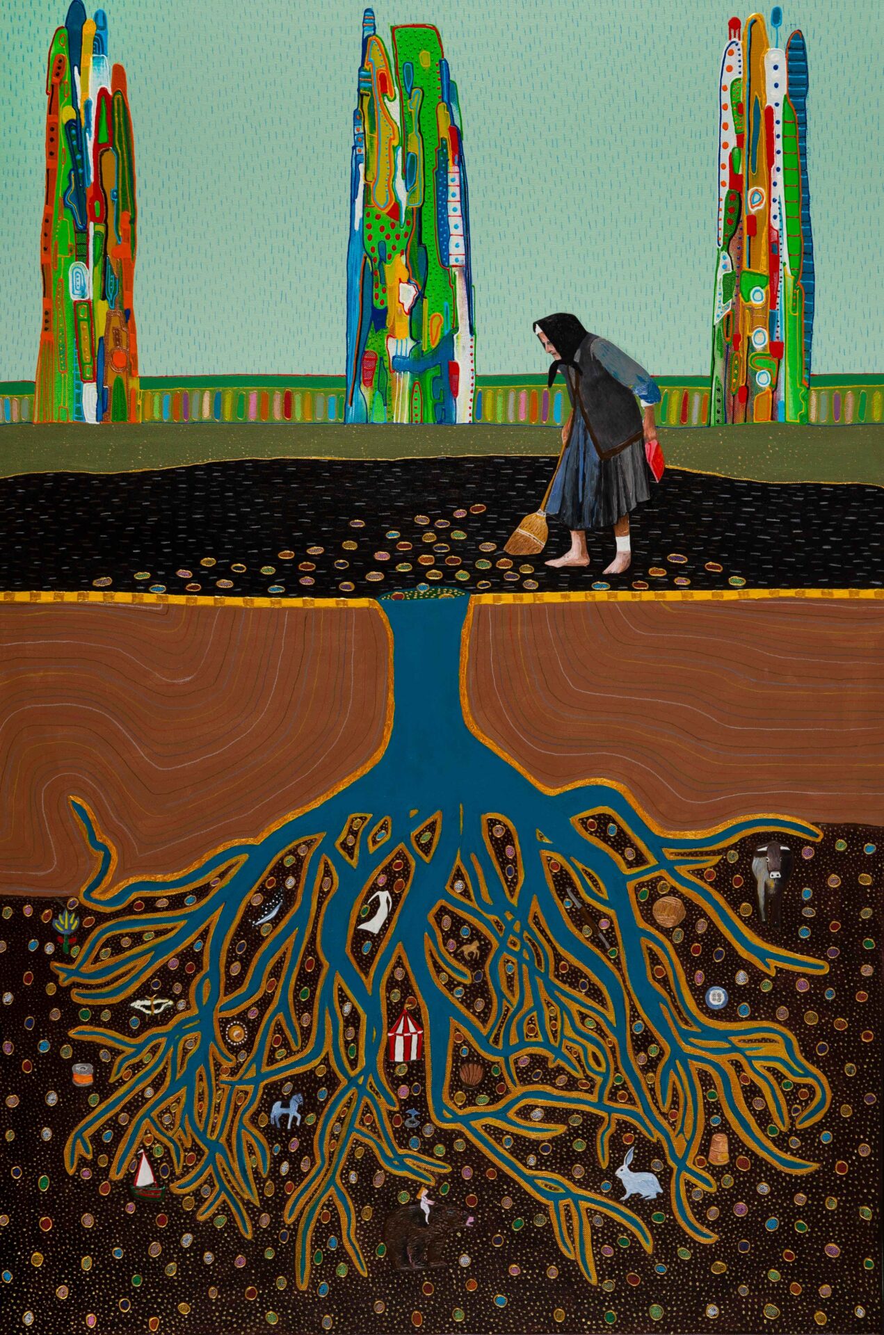 Η αφετηρία αυτής της έκθεσης βρίσκεται στον τόπο όπου η ζωγράφος μεγάλωσε: ένα μικρό χωριό της Κομοτηνής, το Ανθοχώρι, μέσα σε μια φύση γενναιόδωρη και σιωπηλή. Εκεί όπου οι ξεριζωμένες γιαγιάδες της Σμύρνης συναντήθηκαν με τα δέντρα, τις ρίζες και τα πουλιά, εκεί που οι ανέστιοι πρόσφυγες των πολέμων έγιναν και πάλι κορμοί σταθεροί και ρίζες, γεννήθηκαν και οι πρώτες δικές της εικόνες, Οι πρώτες της μνήμες, οι πρώτες ιστορίες που χαράχτηκαν μέσα της και αργότερα μεταμορφώθηκαν σε ζωγραφική. Η ενότητα αποτελεί έναν διάλογο ανάμεσα σε ανθρώπους και δέντρα. Οι γέροντες του χωριού, οι γυναίκες κυρίως, γίνονται στην επιφάνεια του καμβά τοπία και κουβαλούν εποχές: σώματα-κορμοί, βλέμματα-σκιά, χέρια-κλαδιά που ποτέ δεν ξεριζώθηκαν. Μένοντας για πάντα στον τόπο τους, αφήνοντας αποτυπώματα στο χώμα, στον χρόνο, αλλά και στην ψυχή της ζωγράφου.