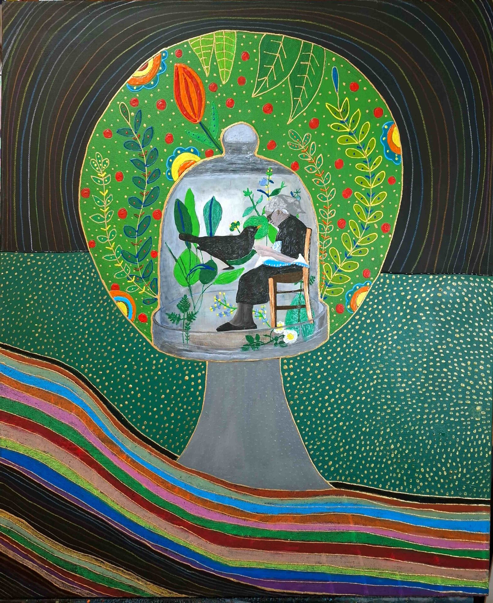 Στον τόπο της Κομοτηνής, φτιαγμένο από διαφορετικές στρώσεις και ετερόκλητα θραύσματα, έμπλεο μνήμης, πολιτισμών, σιωπών και χρωμάτων, η φύση, τυλιγμένη με τρυφερότητα ανθρωποκεντρική, ήταν πάντοτε οικεία σαν δεύτερο σπίτι. «Οι γιαγιάδες ήταν οι μεγάλες εκείνες μορφές που τα φρόντιζαν όλα με τον τρόπο τους, όπως τα δέντρα που προστατεύουν ό,τι γεννιέται από κάτω τους. Οι παππούδες, πιο πολύ σκιές στις αφηγήσεις, απόντες αλλά όχι χαμένοι – η μνήμη τους σπασμένη σε κομμάτια, μα πάντα ζωντανή». Πίσω από το σπίτι της γιαγιάς της ζωγράφου, οι γυναίκες στα χωράφια, μουσουλμάνες που έσπαγαν καπνό, ενώ εκείνη που τις φρόντιζε με έναν καφέ. Εικόνες απλές, αλλά βαθιές, μιας ήσυχης συνύπαρξης. Εικόνες πρωτογένειας, δύναμης και σοφίας που αναδύονται τώρα μέσα από αυτά τα έργα ξανά.