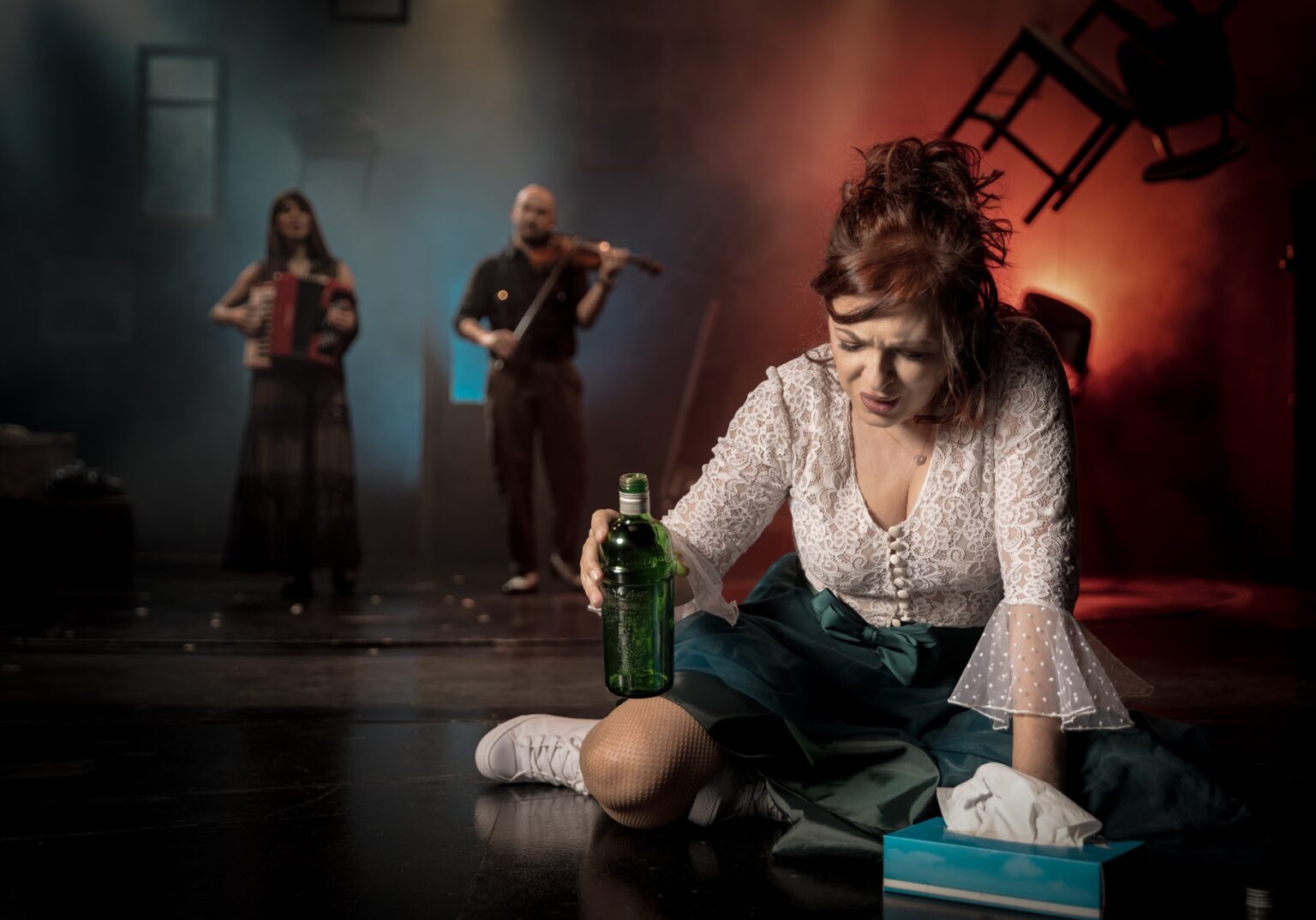 Eπί σκηνής η Μιρέλα Πάχου τραγουδά, παίζει ακορντεόν και όχι μόνο. Στο βιολί ο Αλέξανδρος Ιακώβου.