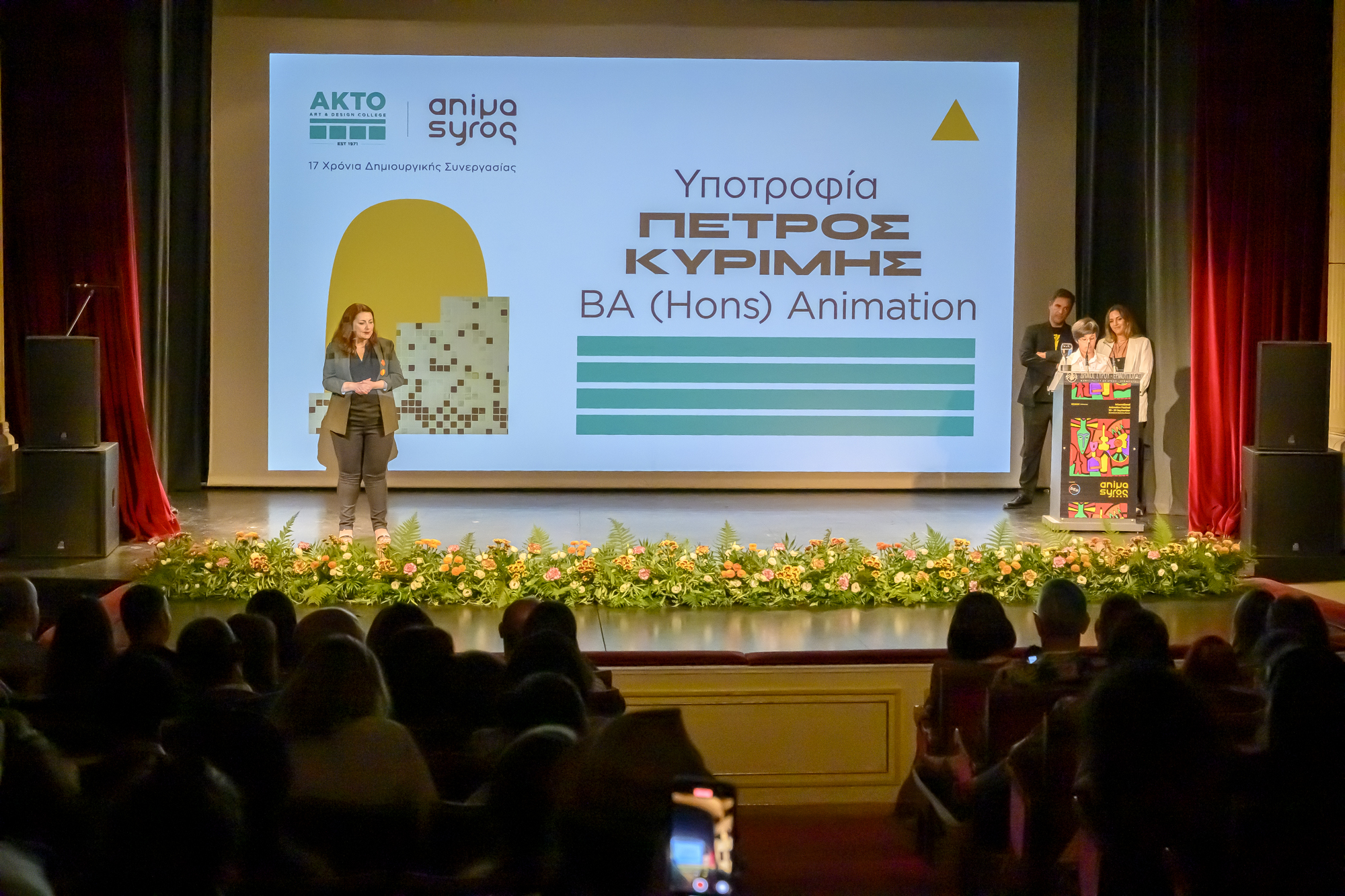 Στη συνέχεια, ο Βασίλης Κ. Καραμητσάνης κάλεσε στη σκηνή του Θεάτρου Απόλλων τη Δρ. Στέλλα Κυρίμη, Διευθύνουσα Σύμβουλο του εκπαιδευτικού ομίλου ΑΚΤΟ, η οποία ανακοίνωσε τη μεγάλη νικήτρια της υποτροφίας “Πέτρος Κυρίμης” προς τιμήν του Πέτρου Κυρίμη, ένα από τα σημαντικότερα έργα του οποίου ήταν η δημιουργία των πρώτων ολοκληρωμένων σπουδών ανιμέισον στην Ελλάδα, που ο ΑΚΤΟ εισήγαγε το 1994. Η υποτροφία, συνολικής αξίας 19.500 ευρώ, απονεμήθηκε στην απόφοιτη Λυκείου Νεφέλη Μανδηλαρά, η οποία θα έχει την ευκαιρία να παρακολουθήσει το τριετές πρόγραμμα προπτυχιακών σπουδών BA (Hons) in Animation, σε συνεργασία με το Middlesex University London, και να ανοίξει τα φτερά της στον μαγικό κόσμο του ανιμέισον.
