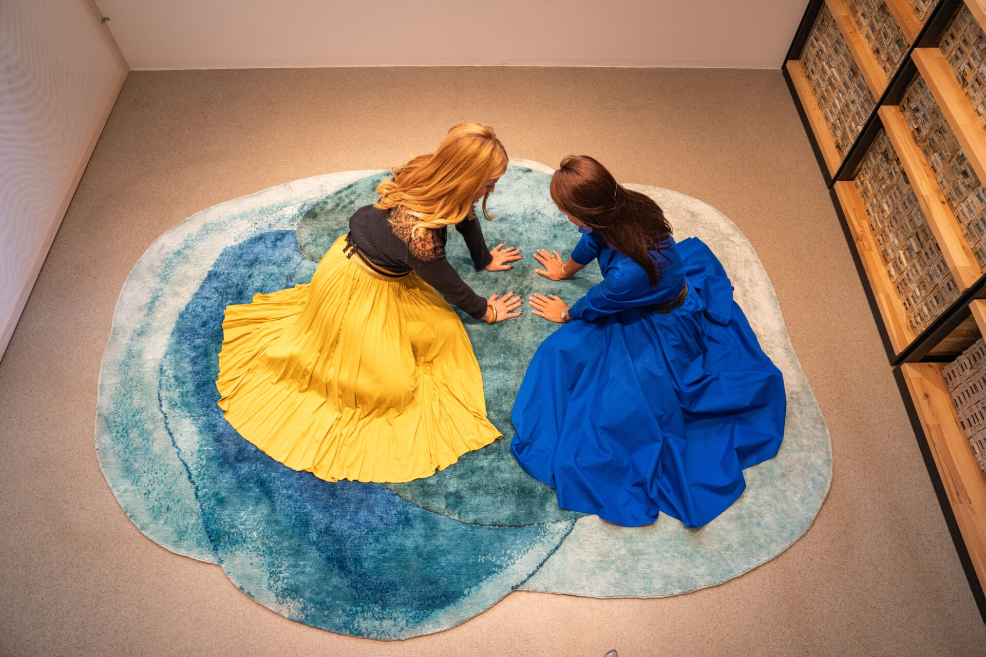 Ηλέκτρα Σουτζόγλου: Και τα συγκεκριμένα έργα δεν θα μπορούσαν να γίνουν με άλλο υλικό. Το μετάξι είναι αυτό που νομίζω συνδέει πάρα πολύ τη Νικομάχη και μπορεί να μεταφράσουμε τα έργα της σε μετάξι, σε μεταξωτά χαλιά. Η Νικομάχη δουλεύει πάρα πολύ με το φως και το νερό και αυτό πώς μπορείς να το κάνεις; Αυτό ήταν και ένα από τα challenges που είχαμε μεταξύ μας. Πώς θα μπορούμε να το μεταφράσουμε; Γιατί εμείς δεν πάμε να κοπιάρουμε ένα έργο τέχνης. Πάμε να δούμε πώς με το νέο αυτό υλικό και αυτό το μέσο μπορούμε να το μεταφράσουμε καλύτερα. Οπότε το μετάξι επειδή έχει αυτή την τρομερή ιδιότητα με το φως να αλλάζει, άμα δεις, άμα πας γύρω γύρω το βλέπεις, αλλάζουμε τον φωτισμό, αλλάζει όλο. Το πιάνεις, αλλάζει …και έτσι είναι ένα ζωντανό πράγμα, όπως είναι και το φως και το νερό, γι’ αυτό και τα χαλιά αυτά είναι ολομέταξα.