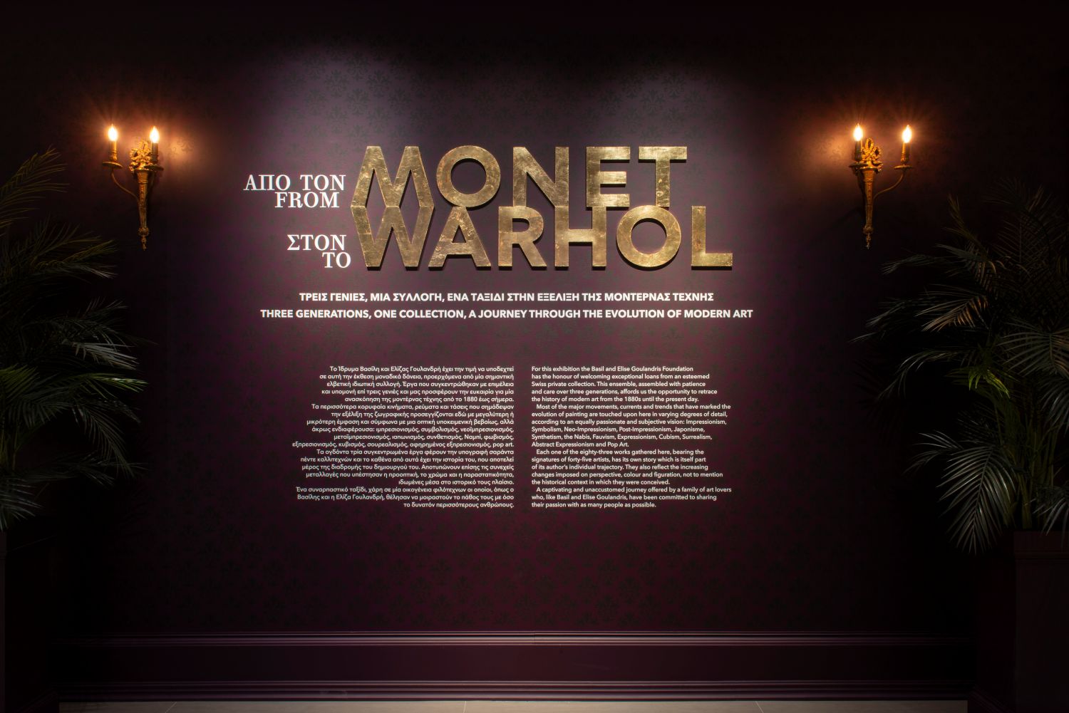 Με αυτό το πνεύμα, η έκθεση Από τον Monet στον Warhol συγκεντρώνει 83 αριστουργήματα από 45 κορυφαίους δημιουργούς, μέσω μιας ενιαίας συλλογή, συνθέτοντας ένα εντυπωσιακό πανόραμα της τέχνης από τον 19ο αιώνα έως σήμερα. Η έκθεση οφείλεται στον γενναιόδωρο δανεισμό μιας ελβετικής ιδιωτικής συλλογής, ενός σώματος έργων που γεννήθηκε από πάθος για τη νεότερη ζωγραφική και καλλιεργήθηκε υπομονετικά μέσα από τρεις διαδοχικές γενιές. Μια συλλογή που παντρεύει τη βαθιά προσωπική ματιά των κατόχων της με τη συνοχή και την αρτιότητα που χαρακτηρίζουν τα σημαντικότερα ιδιωτικά σύνολα παγκοσμίως. Πίσω από το μικρόβιο της λατρείας αυτής της οικογένειας για την τέχνη, η συλλογή διηγείται πάνω από δεκαπέντε καλλιτεχνικά κινήματα – από τον ιμπρεσιονισμό και τον συμβολισμό έως τον κυβισμό, τον σουρεαλισμό, τον αφαιρετικό εξπρεσιονισμό και την pop art – αναπτύσσοντας έναν ζωντανό διάλογο που ανασυνθέτει, σαν χρονική τοιχογραφία, την εξέλιξη της μοντέρνας τέχνης.