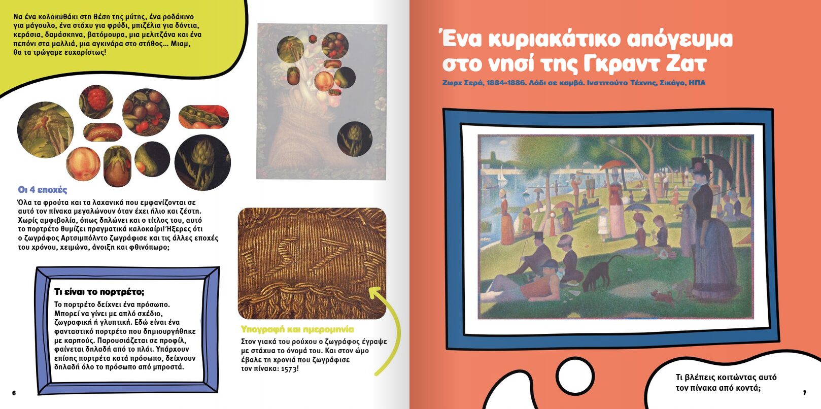 Στο Κυριακάτικο απόγευμα στο νησί της Γκραντ Ζατ του Georges Seurat το παιδί καλείται να πλησιάσει. Να δει τις μικρές κουκκίδες. Να μάθει τη λέξη «πουαντιγισμός» χωρίς να τρομάξει από αυτήν. Να καταλάβει πως ένας πίνακας μπορεί να χρειάστηκε δύο χρόνια δουλειάς και πως η υπομονή είναι κι αυτή μέρος της τέχνης.