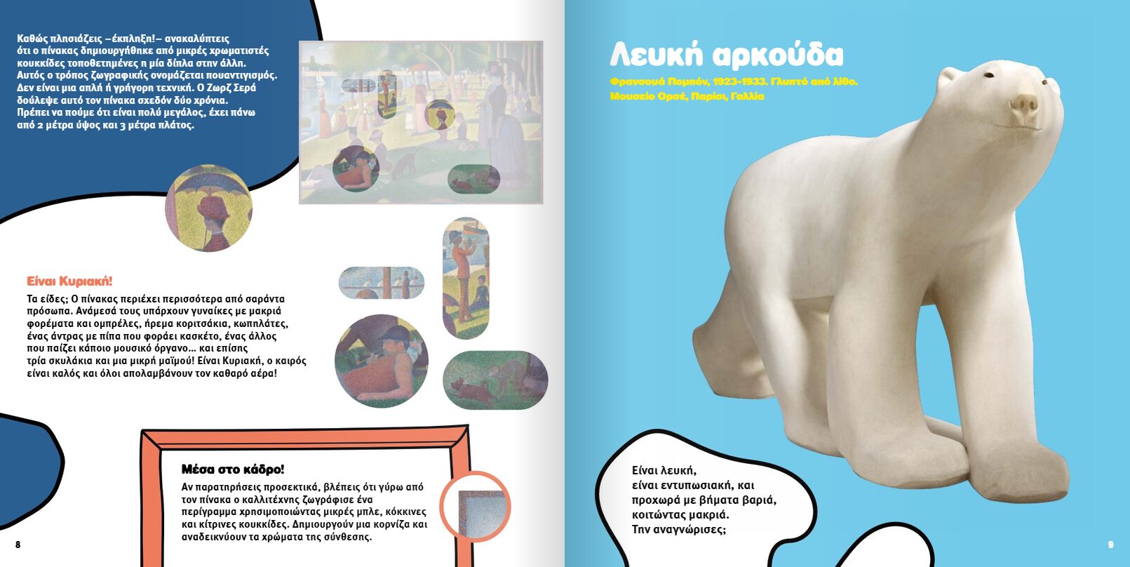 Και έπειτα, η λευκή αρκούδα του François Pompon. Ένα γλυπτό λιτό, καθαρό, σχεδόν ήσυχο. «Την αναγνώρισες;» ρωτά το βιβλίο. Γιατί η τέχνη δεν είναι μακρινή. Είναι κάτι που μπορούμε να δούμε, να ονομάσουμε, να πλησιάσουμε. Και αυτό είναι το μεγάλο στοίχημα του βιβλίου. Όχι να κατανοήσουμε αλλά να πλησιάσουμε και να παρατηρήσουμε. Να εξοικειωθούμε. Να μεταμορφώσει το μουσείο σε ένα μέρος περισσότερο διασκεδαστικό και λιγότερο τρομακτικό. Και ένα έργο να το κάνει να μοιάζει με ένα παιχνίδι ανακάλυψης.