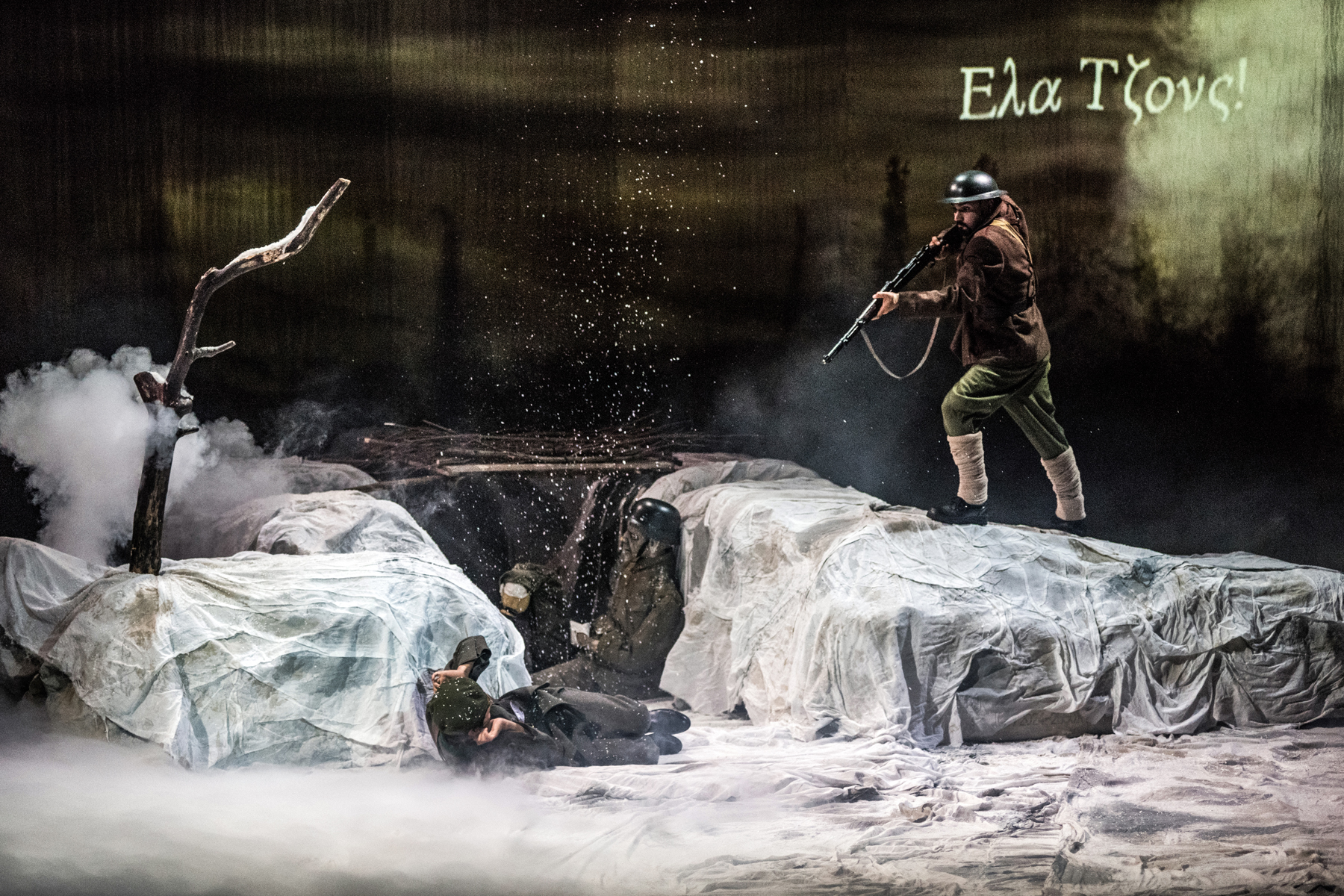 Οι ισχυροί της Ιστορίας θα εμφανιστούν ως ζοφερές, εφιαλτικές αλλά ταυτόχρονα γελοίες μάσκες. Σαν ξεκούρδιστες μαριονέτες μιας ιδιότυπης χλευαστικής παντομίμας που υιοθετώντας εμπρόθετα μια σχηματική ερμηνεία, με τη φωνή τους να ακούγεται με τεχνολογικά μέσα συχνά εκτός του σώματός τους, έρχονται σε ευθεία αντίθεση με την ανθρώπινη, δοκιμαζόμενη τοιχογραφία που αναπαριστά τον βασανισμένο λαό. Μόνο θαυμασμό και δέος για την εγρήγορση, την ετοιμότητα, την πνευματικότητα, τον συντονισμό, την ευπλαστότητα των σωμάτων τους καθώς και για την αξεπέραστα υψηλή υποκριτική ποιότητα των ηθοποιών της. Σε αυτούς οφείλουμε να προσθέσουμε το γλωσσικό μωσαϊκό των φωνών και γλωσσών που ακούγονται σε όλη τη διάρκεια της παράστασης.