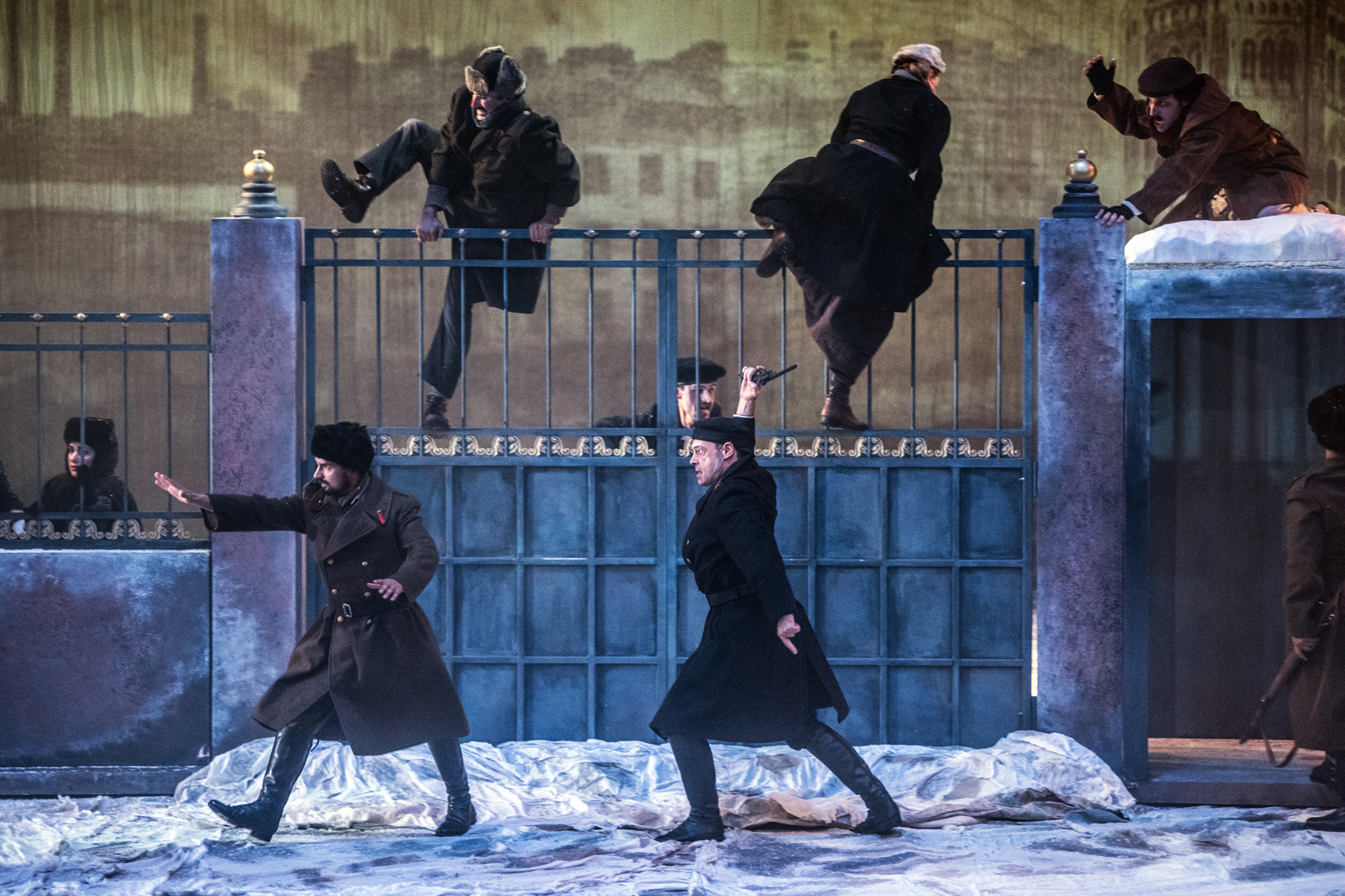 Ο Λένιν, που ο Τρότσκι αποκαλεί «Μαξιμιλιανό» προσδίδοντάς του τις τρομερές ιδιότητες του Ροβεσπιέρου ομολογεί κυνικά για την Ουκρανία ότι δεν μπορούν οι Μπολσεβίκοι να επιτρέψουν την ανεξαρτησία στον μεγαλύτερο σιτοβολώνα της Ευρώπης. Υπονοείται επίσης η ακραία βιαιότητα του Στάλιν. Και από την άλλη ο λαός που εξοντώνεται. Από τον αιματηρό Α’ παγκόσμιο πόλεμο των χαρακωμάτων όπου βλέπουμε τον στρατιώτη που ξεψυχά από σφαίρα ενώ γράφει γράμμα στη γυναίκα του ως τις Ρωσίδες μανάδες που παρακινημένες από την ακραία πείνα έκλεβαν ψωμί και διαδήλωναν για την τροφή των παιδιών τους να σκοτώνονται χωρίς έλεος από τους Κοζάκους. Τα αποσπάσματα από τον «Βυσσινόκηπο» του Αντόν Τσέχωφ που παρεισφρέουν στη σκηνική αφήγηση προαναγγέλλουν τη μεγάλη αλλαγή.