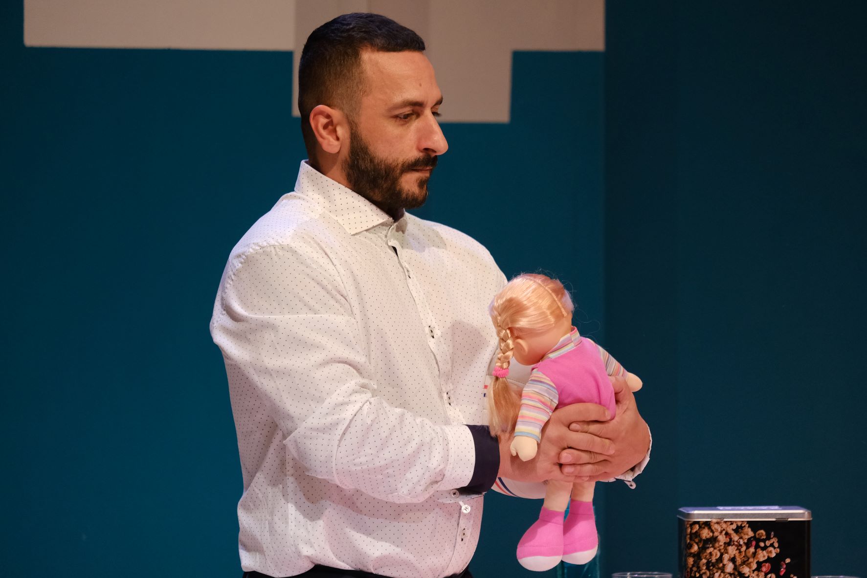 Ο μικρόκοσμός τους μπερδεύεται, όταν μια μέρα καταφθάνει ένας νέος «μπαμπάς» (Φώτης Λαζάρου), που θα αναλάβει τον ρόλο του «κυρίου» του σπιτιού, απαιτώντας να τον υπακούν όλοι, φωνάζοντας συχνά, ενθαρρύνοντας έμφυλες διακρίσεις και στερεότυπα βαθιά ριζωμένα που μάλλον δεν ακουμπούν στην πραγματικότητα της ζωής αυτού του σπιτιού: το κορίτσι πρέπει να κάνει τις δουλειές του σπιτιού, το αγόρι να παίζει ποδόσφαιρο και να φοράει παντελόνια. Αρχικά το μένος όλων θα πέσει πάνω του αλλά σε μια δεύτερη ανάγνωση, μάλλον και ο ίδιος μοιάζει να ξεσπάει στο σπίτι μόνο τον θυμό και την επιθετικότητα που εισπράττει ο ίδιος στον χώρο εργασίας του καθημερινά.