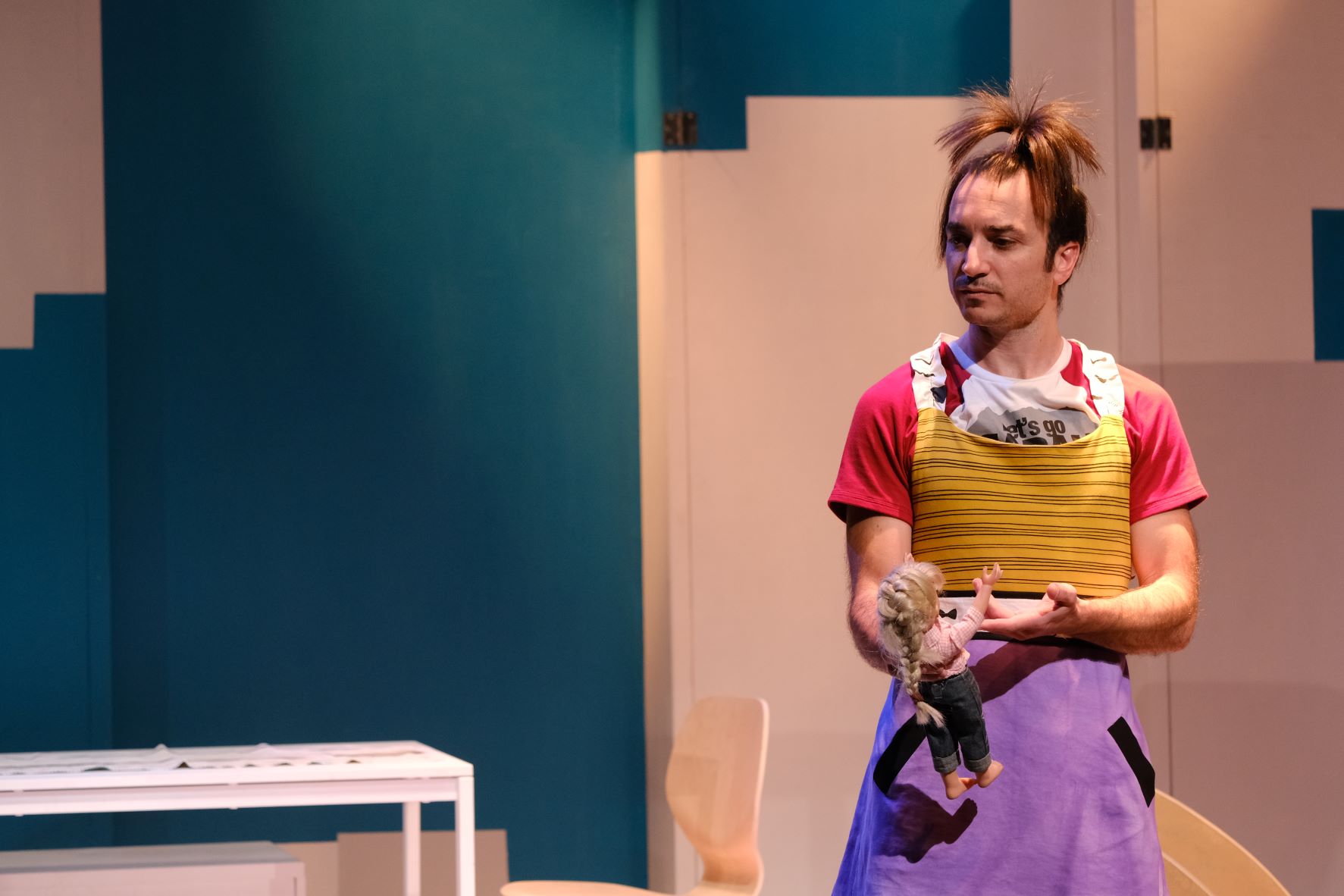 Όλοι τους στη σκηνή επαναλαμβάνουν λόγια, δοκιμάζουν εκφραστικούς τύπους, τραγουδούν. Σε μια σκηνή μάλιστα λίγο πριν ξεκινήσουν την επανάστασή τους τα παιδιά, αποφασίζουν να αλλάξουν ρούχα. Η Τζίνα να φορέσει τα «αγορίστικα» του Μάρκου, και αντίστοιχα εκείνος να βάλει τα κοριτσίστικα της Τζίνα. «Προσπαθούν εδώ τα δύο παιδιά να κοντράρουν τα κλισέ με τα οποία υποφέρει ο καθένας τους και τελικά καταλήγουν με διαφορετικά ρούχα. Είναι μια από τις σκηνές που είναι υπό κατασκευή γιατί υπάρχουν στιγμές που χρειάζονται καταιγιστικό ρυθμό, εμπλοκή του κοινού για να δούμε τι βιώνουν και τα παιδιά ως θεατές».