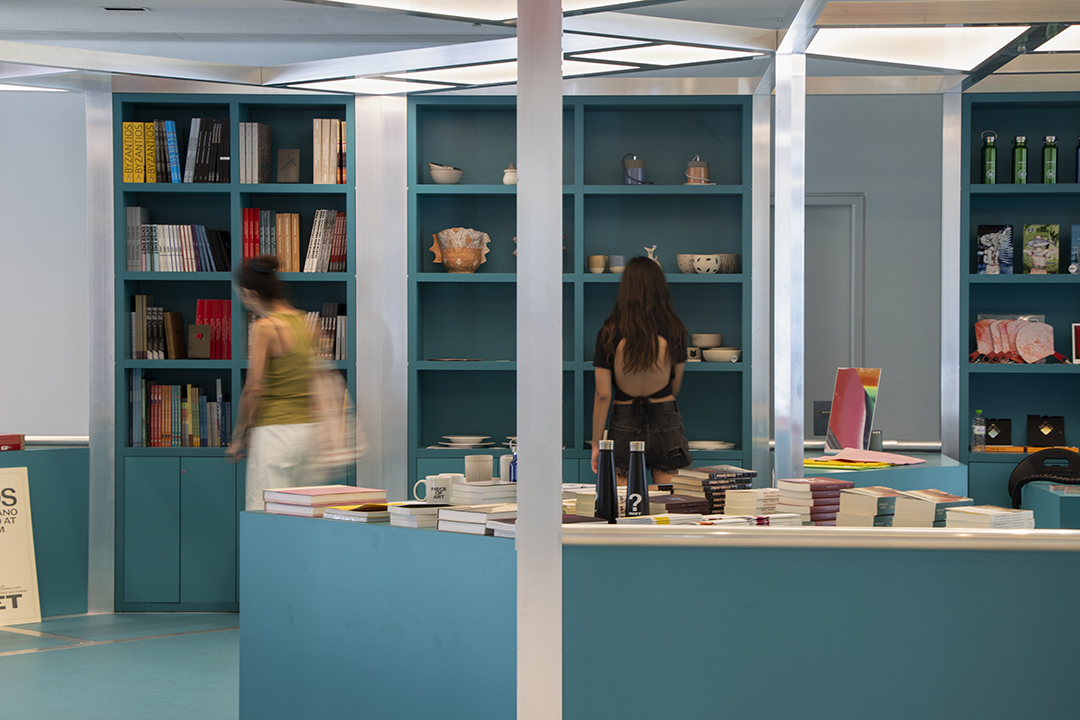 Το νέο Shop at ΕΜΣΤ είναι ένα έργο που υλοποιήθηκε με σκοπό να εμπλουτίσει την εμπειρία των επισκεπτών και να ολοκληρώσει τη μεταμόρφωση της εισόδου του Μουσείου. Ο σχεδιασμός του ανατέθηκε στον καλλιτέχνη Philip Metten, στο πλαίσιο του Προγράμματος Φιλοξενίας (Residency), ο οποίος δημιούργησε ένα πρωτότυπο pavilion-πωλητήριο σε διάλογο με την αρχιτεκτονική του κτηρίου. Επιπλέον, το έργο βασίζεται στα χαρακτηριστικά διαγράμματα του καλλιτέχνη, μια μορφική γλώσσα που θυμίζει tangram –αρχαίο κινέζικο παζλ– και την οποία εφαρμόζει με συνέπεια σε όλο του το έργο.Το Shop at ΕΜΣΤ προσφέρει αντικείμενα σχεδιασμένα ειδικά για το Μουσείο –κοσμήματα, τσάντες, σημειωματάρια– εμπνευσμένα από τις εκθέσεις και τη Συλλογή του, καθώς και μικρά έργα τέχνης σε περιορισμένα αντίτυπα, από σύγχρονες Έλληνες και Ελληνίδες καλλιτέχνες και καλλιτέχνιδες. Παράλληλα, το πωλητήριο περιλαμβάνει τις τρέχουσες και παλαιότερες εκδόσεις του Μουσείου, προσφέροντας έτσι ένα επιλεγμένο φάσμα από καταλόγους εκθέσεων, μονογραφίες και θεωρητικά κείμενα.