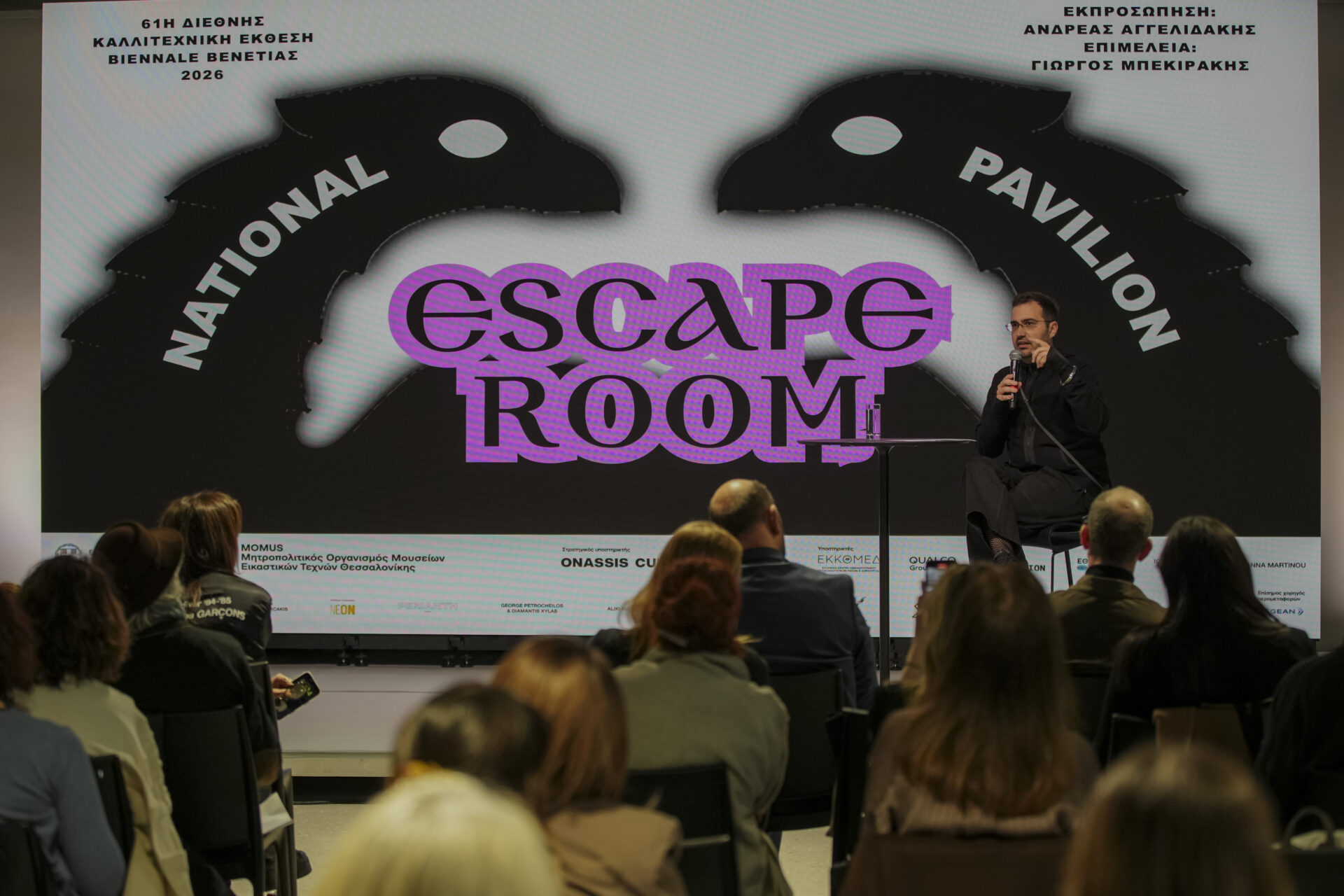 Στο video wall, στον χώρο του Onassis Ready εμφανίζεται η πρόσοψη του Ελληνικού Περιπτέρου στα Giardini της Βενετίας, γράφει “Grecia” και μέσα από τις πύλες του, παίζουν βίντεο σε λούπα με τον Γιώργο Μαρίνο, την Αλίκη Βουγιουκλάκη ως «Κατάσκοπο Νέλλη», μηνύματα σε φούξια γράμματα που λένε: Ελλάς Ελλήνων χριστιανών, έτσι τα έθνη ζουν, άνευ βουλής και εκλογών, Ταρατατζούμ. Άπειρες εικόνες σκάνε στα μάτια μας, κάποιες πολύ οικίες, στιγμιότυπα από ταινίες όπως η Επίθεση του γιγαντιαίου μουσακά, τσαρουχικά φτερά, σημαίες κομματικές, αποκόμματα από εφημερίδες. Κι ανάμεσα στους κίονες του Περιπτέρου εμφανίζεται κι ο Χίτλερ, στιγμιότυπα από εϊτίλες και δύο χρονολογίες: 1934 και 2026. Η πρώτη αφορά την πρώτη μας ελληνική συμμετοχή στην Μπιενάλε Βενετίας και το 2026 εύλογα αφορά το τώρα, εδώ που βρισκόμαστε στη συνέντευξη Τύπου για την παρουσίαση του Ελληνικού Περιπτέρου στην 61η Διεθνή Έκθεση Τέχνης – La Biennale di Venezia με το έργο “Escape Room” από τον εικαστικό και αρχιτέκτονα που εκπροσωπεί την Ελλάδα, Ανδρέα Αγγελιδάκη, σε επιμέλεια Γιώργου Μπεκιράκη.