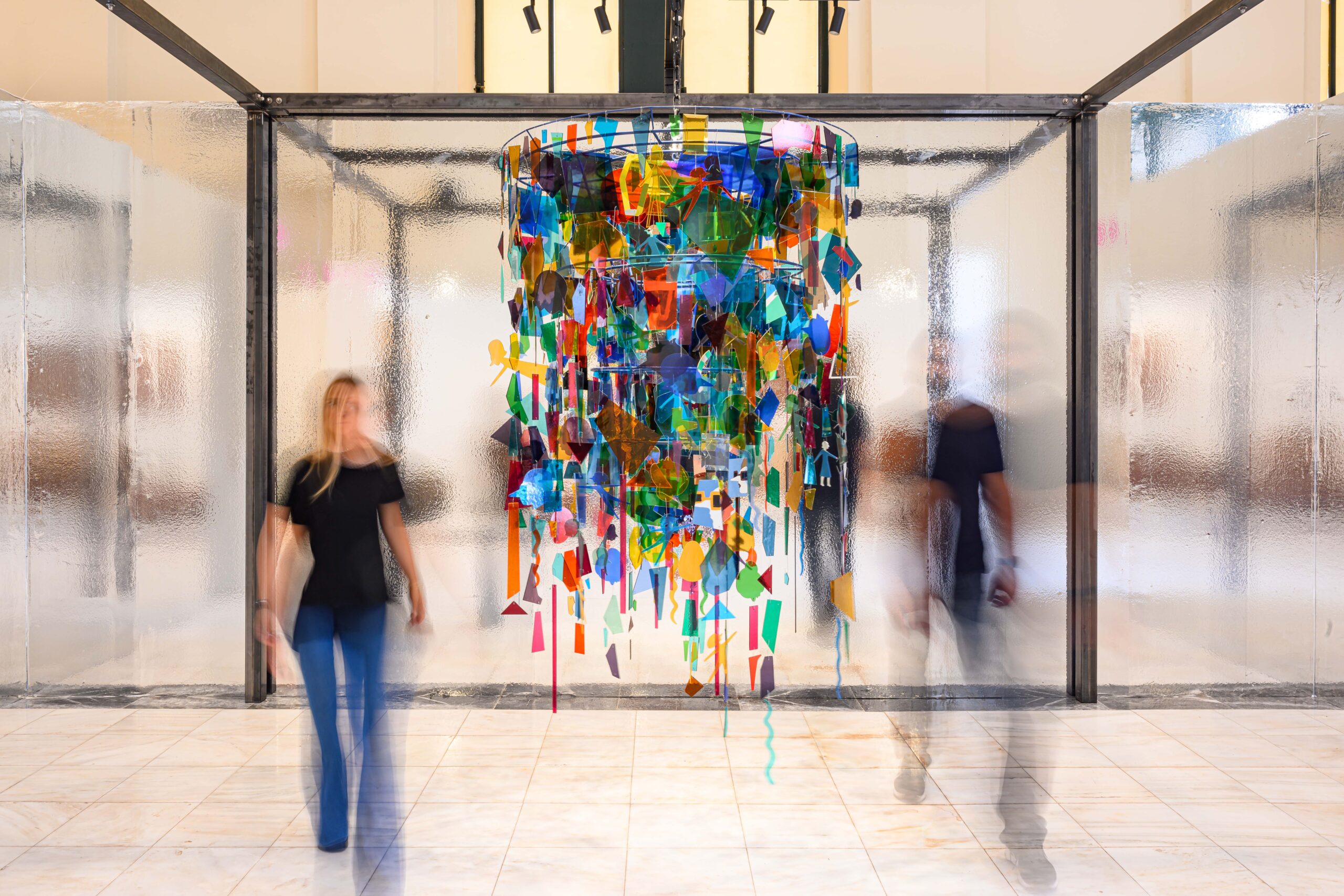 Η Λώρα Τσουκαλά μάς υποδέχεται στο περίπτερο και μάς εξηγεί πως τα διαφορετικά γυάλινα κομμάτια είναι όλα χειροποίητα προερχόμενα από την Αμερική και το Μεξικό, με μοναδική μορφή και διάσταση. Περπατώντας μαζί της γύρω από το έργο μας δείχνει εμπράκτως πως ενώ η αρχιτεκτονική του σύνθεση αρχικά μοιάζει ακανόνιστη, η προσεκτική επιλογή και τοποθέτηση κάθε κομματιού δημιουργεί μια απροσδόκητη ομοιογένεια, αποτέλεσμα της δημιουργικότητας του καλλιτέχνη.