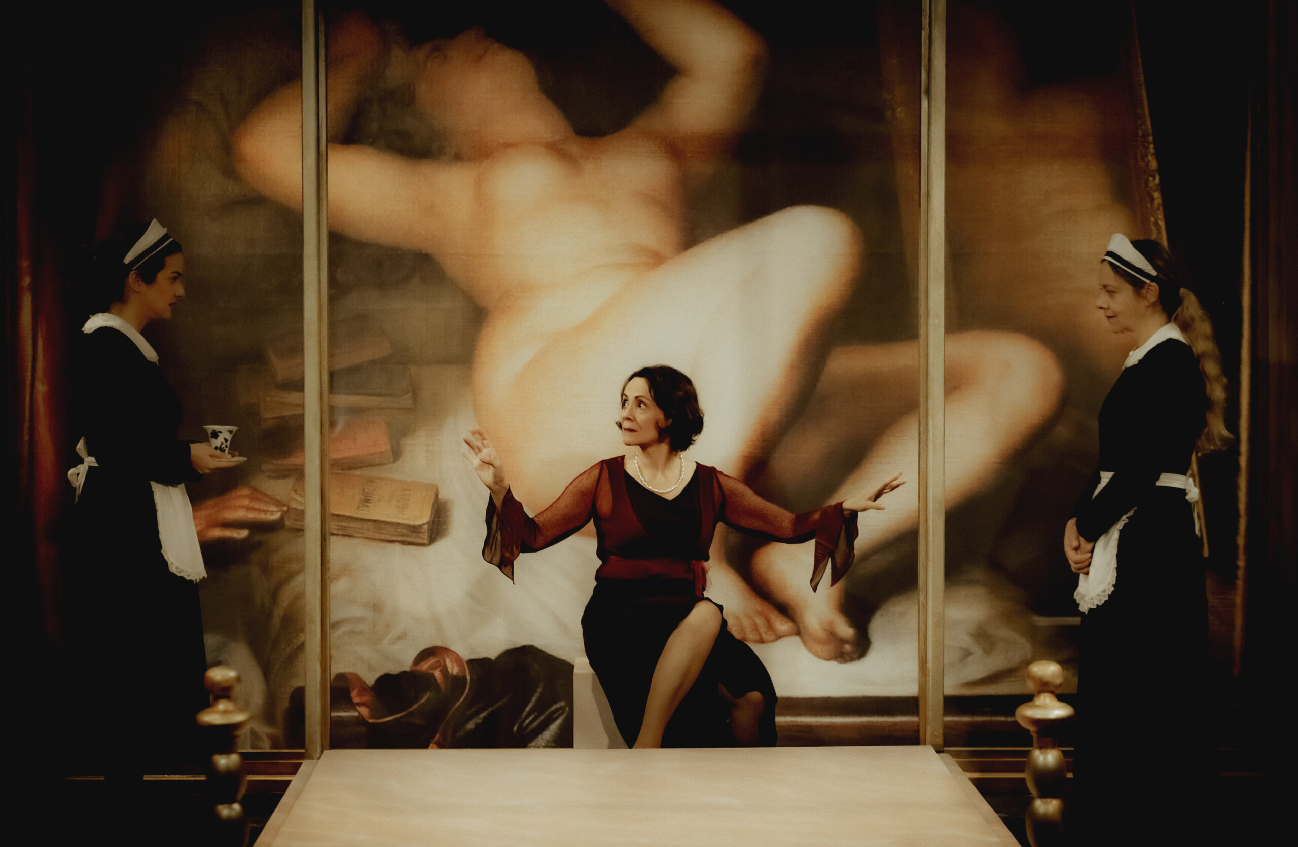 Ο πίνακας είναι μια ιδέα που ξεκίνησε από όλη την ιστορία των δύο αδελφών. Αυτές οι δύο τρέφονται με αναγνώσματα. Διαβάζουν λαϊκά περιοδικά -αλλά διαβάζουν. Αυτός ο πίνακας απεικονίζει μια γυναίκα γυμνή, η οποία είναι σε ένα δωμάτιο –σχεδόν το δωμάτιο-κλουβί, στο οποίο ζουν οι δύο αδελφές- και διαβάζει. Κάποιος, ένα χέρι, της δίνει ένα ανάγνωσμα, ένα βιβλίο. Υπάρχει ένα πρόσωπο στην άκρη κρυμμένο, υπάρχει κουρτίνα, υπάρχει ο καθρέφτης. Αυτά τα στοιχεία με οδήγησαν σε αυτό τον πίνακα, συν το γεγονός ότι είναι ένας πίνακας που αγαπούσε πάρα πολύ ο Μαγκρίτ. Ο Μαγκρίτ καθόρισε πολύ τη ματιά μου. Ξεκίνησε ως μια έμπνευση από το Bilboquet, που είναι το μέρος –ένα νάιτ κλαμπ; δεν ξέρει κανείς ακριβώς- όπου συναντάει η Κυρία τον Κύριο όταν αυτός απελευθερώνεται. Και είναι βασικό μοτίβο του Μαγκρίτ το bilboquet. Είναι ο κόσμος του Μαγκρίτ. Και έγινε μοτίβο σε αυτούς τους όγκους δεξιά και αριστερά στη σκηνή: γίνεται κρεβάτι ή όχι, και το βλέπει κανείς, παρακολουθώντας την παράσταση καταλαβαίνει τι εννοώ. Και η έννοια του πλαισίου: δεν είναι παρά ο καθρέφτης μέσα στον καθρέφτη, η διαφάνεια πίσω από αυτό που είναι η ιματιοθήκη, ή όπως υπέροχα έχει μεταφράσει ο Δημητριάδης: το σκευοφυλάκιο. Αυτό το κρεβάτι που δεν είναι κρεβάτι, που είναι από μάρμαρο, με το πλαίσιο μέσα στο πλαίσιο που είναι ανάποδος καθρέφτης όπου, δεν υπάρχει είδωλο. Ένα μπουντουάρ, το οποίο είναι αόρατο, δημιουργείται μια ζώνη εκεί.
