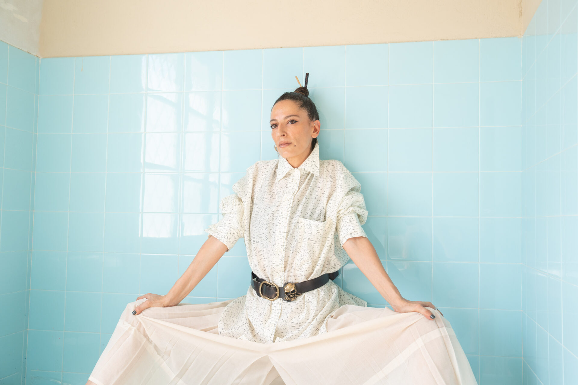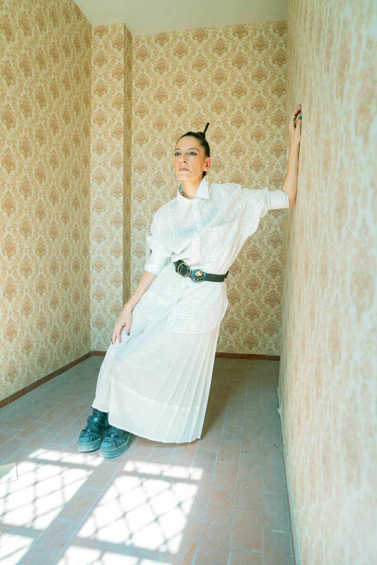 Με αφορμή την παράσταση Hystory της χορογράφου Πατρίσιας Απέργη που θα μπορούμε να παρακολουθήσουμε από 21 έως 24 Ιουλίου στην Πειραιώς 260 στο πλαίσιο του grape – Greek Agora of Performance του Φεστιβάλ Αθηνών Επιδαύρου θέλησα να συνομιλήσω μαζί της, αφού την φωτογραφίσαμε πρώτα σε έναν ιδιαίτερο χώρο, το Κτήμα Ευταξία στην Ελευσίνα. Παρατηρούσα την Πατρίσια Απέργη καθώς άλλαζε ρούχα και περιφερόταν από τον ένα χώρο στον άλλο. Ένιωθα σαν να έβλεπα μια πυργοδέσποινα άλλης εποχής στα δωμάτια ενός απογυμνωμένου από έπιπλα οικήματος να στέκει αγέρωχη μόνη και παρούσα περιμένοντας τους καλεσμένους της που αργούν κι ίσως δεν έρθουν ποτέ. Το τώρα, το ύστερα, το μετά μου γαργαλούσαν το μυαλό. Έκανε ζέστη, ιδρώσαμε κι ύστερα ξαποστάσαμε και τα είπαμε.