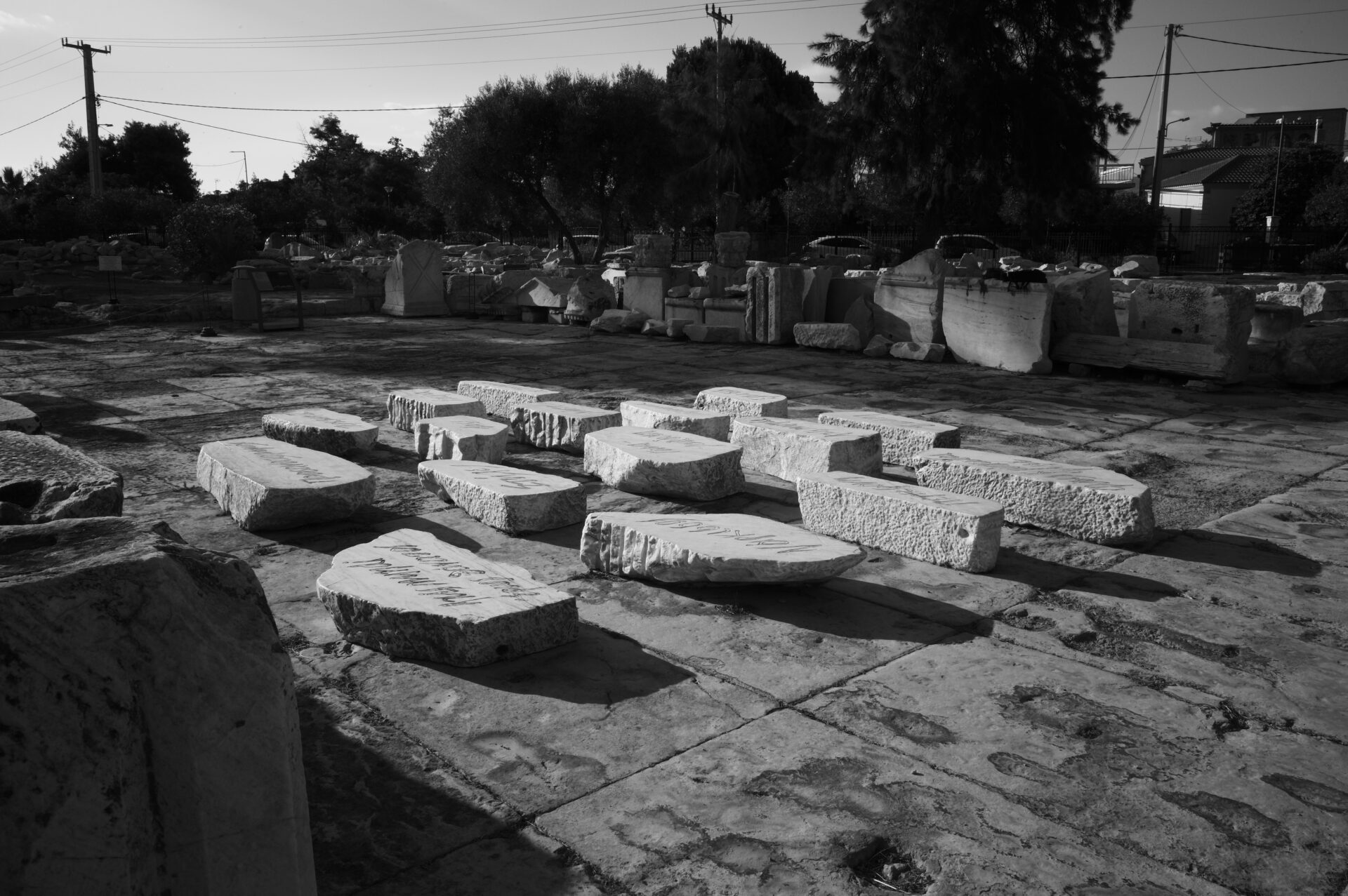 Τη λέξη Ελευσίνα την άκουσα στην πρώτη δεκαετία της ζωής μου, όταν στην πατρική επιχείρηση κατεύθαναν από την Ελευσίνα σάκοι τσιμέντων με γραμμένη τη λέξη Titan, επρόκειτο να χρησιμοποιηθούν για το κόψιμο όπως έλεγαν τσιμεντόλιθων, υλικό φτηνό που χρησιμοποιήθηκε για να στεγάσουν τις οικογένειές τους οι άνθρωποι που έφταναν από την επαρχία στην Αθήνα. Αυτή η επιχείρηση περνώντας σε άλλη μορφή μεταφέρθηκε στην Ιερά Οδό. Ήταν η περίοδος των κατεδαφίσεων στην Αθήνα και στις μεγάλες αποθήκες μεταφέρονταν αρχιτεκτονικά μέλη από εμβληματικά κτίρια του 19ου αιώνα από την ανάγκη της κατοικίας στη φύλαξη πολύτιμων υλικών, τα οποία χρησιμοποιήθηκαν πολλές φορές με σεβασμό στις νέες κατοικίες. Παράλληλα με την επιδρομή των υλικών του παρελθόντος εγώ εισήλθα σε ένα ακόμη παλαιότερο παρελθόν, καθώς η ελληνική αρχαιότητα είχε ήδη εγκατασταθεί μέσα μου κατά την περίοδο της προετοιμασίας για τη Σχολή Καλών Τεχνών σχεδιάζοντας με επιμονή στο αρχαιολογικό μουσείο.