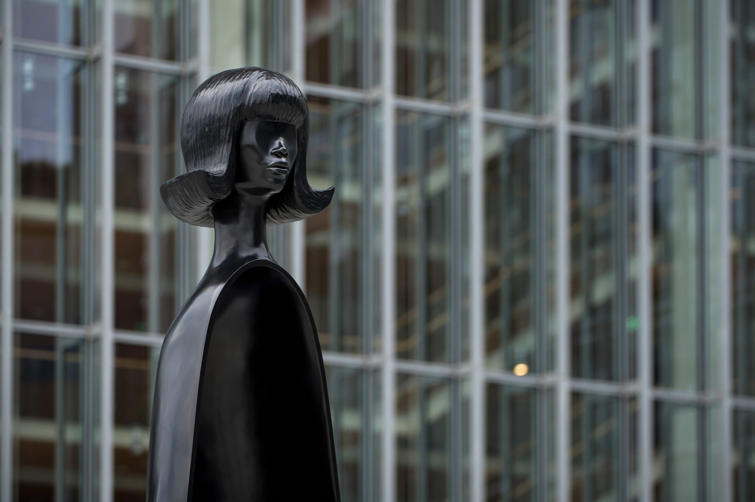 Στο κεφάλι, τα μαλλιά είναι φορμαρισμένα σε ένα εντυπωσιακό κοντό καρέ κούρεμα με αφέλειες και καμπυλωτές προς τα έξω άκρες, ένα στιλ που κυριαρχούσε κατά τη δεκαετία του 1960 και το οποίο χρησιμοποιεί για πρώτη φορά η Simone Leigh, εμπλουτίζοντας έτσι το ενδιαφέρον της για την ιστορία των χτενισμάτων και της πολιτιστικής τους σημασίας. Τα διάφορα στιλ κομμώσεων είναι εδώ και πολλά χρόνια ένα από τα σημαντικά θέματα που επεξεργάζεται η καλλιτέχνιδα. Στις κομμώσεις που έχει χρησιμοποιήσει στα γλυπτά της, συμπεριλαμβάνονται οι περίτεχνες πλεξούδες και τα εντυπωσιακά αφρικανικά χτενίσματα με μικροσκοπικές ροζέτες που είναι δουλεμένες μία-μία στο χέρι.