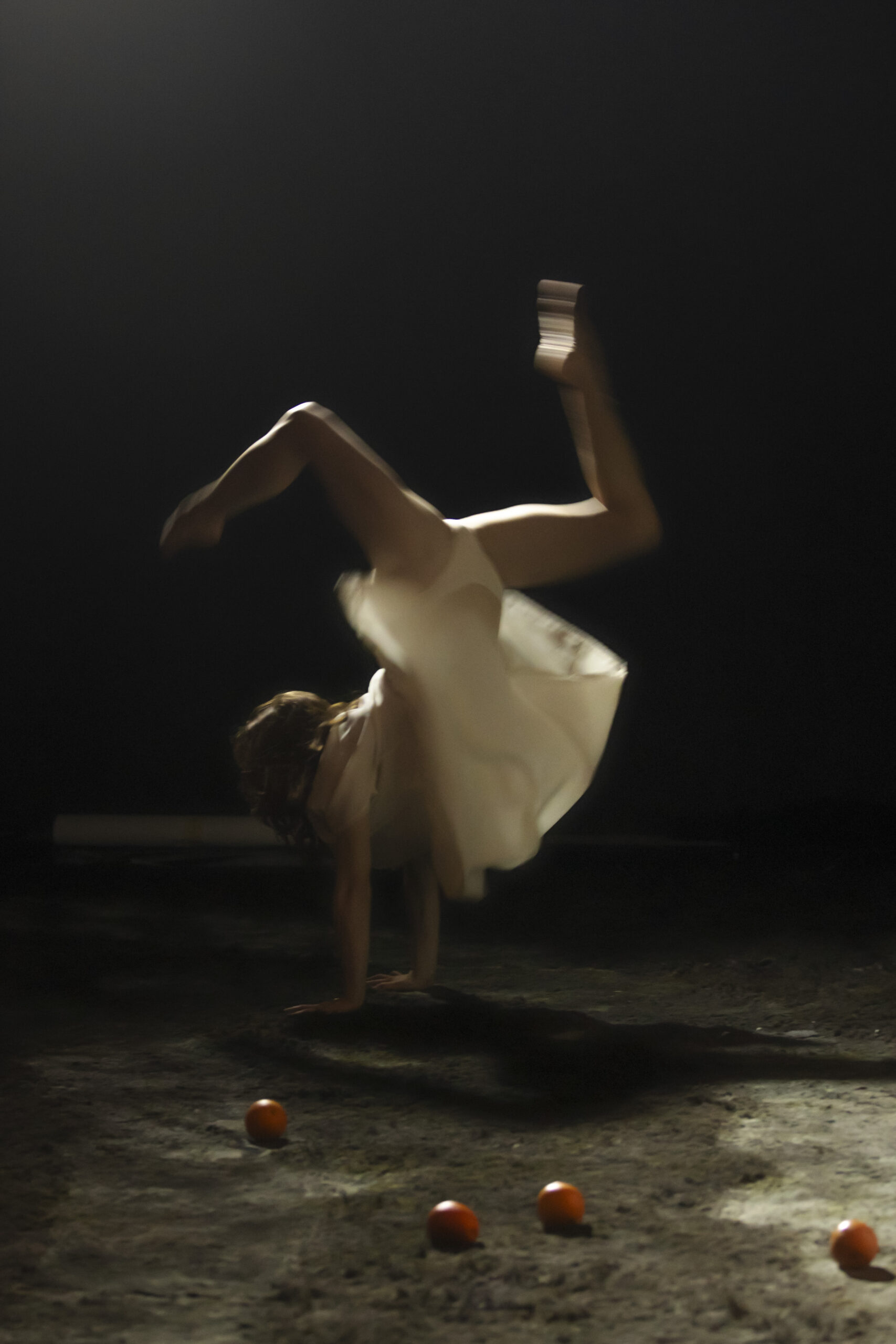 Η Παναγιώτα για πρώτη φορά βλέπει τον εαυτό της στο θέατρο σε κάτι performative: «Τελειώνοντας το 2022 την Κρατική Σχολή Ορχηστρικής Τέχνης, είχα στο μυαλό μου ότι θέλω να κάνω κάτι σαν αυτό που έκανε ο Μάριο, ήθελα πάρα πολύ να κάνω σωματικό θέατρο και κάπως χρειαζόμουν μια απόσταση από τον χορό για αποσυμπίεση, να πάρω λίγο τον χρόνο μου να δω λίγο πιο καθαρά, αν θα μου λείπει όλο αυτό.