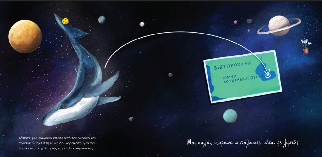 Η γραφή της Μαρίσιας Θωμαδάκη, ώριμη και παιχνιδιάρικη ταυτόχρονα, χτίζει μια ιστορία ανακάλυψης του εαυτού με συμβολισμούς που μιλούν τόσο στον μικρό όσο και στον μεγαλύτερο αναγνώστη. Η εικονογράφηση της Μπιάνκα Στρατάκη, φρέσκια και ευέλικτη, κινείται ανάμεσα σε μινιμαλιστικές και πιο έντονες συνθέσεις γεμάτες στοιχεία. Οι εναλλαγές μεγέθους της φάλαινας, το διαφορετικό βλέμμα εστίασης και τα ποικίλα χρωματικά τοπία δημιουργούν ένα συνεχές οπτικό παιχνίδι που εμπλουτίζει την αφήγηση, δίνοντάς της βάθος και αίσθηση κίνησης.