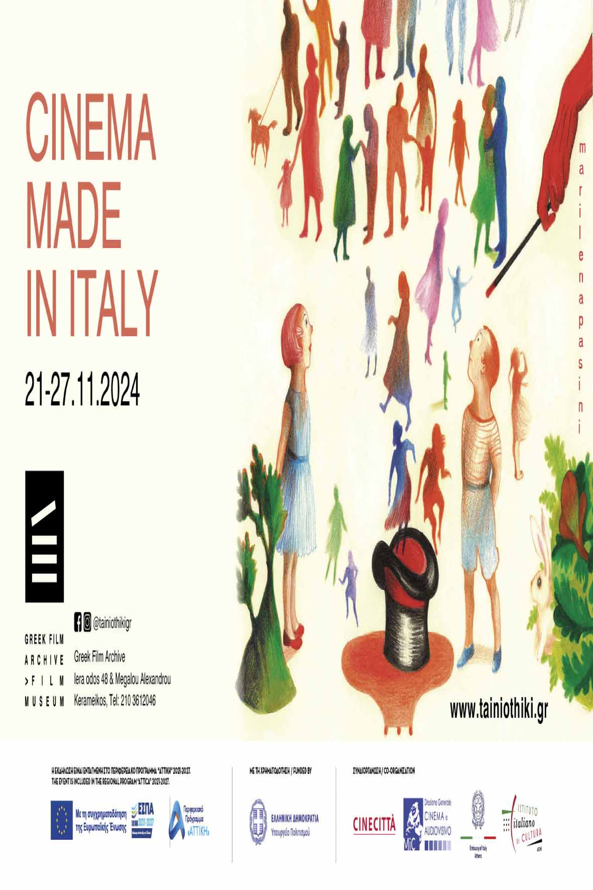 Η Ταινιοθήκη της Ελλάδος, η Cinecittà, η Ιταλική Πρεσβεία στην Ελλάδα και το Ιταλικό Μορφωτικό Ινστιτούτο Αθηνών συνδιοργανώνουν το φετινό Cinema Made in Italy, το οποίο θα πραγματοποιηθεί από τις 21 έως και τις 27 Νοεμβρίου στην Ταινιοθήκη της Ελλάδος. Λεπτομέρειες Φεστιβάλ