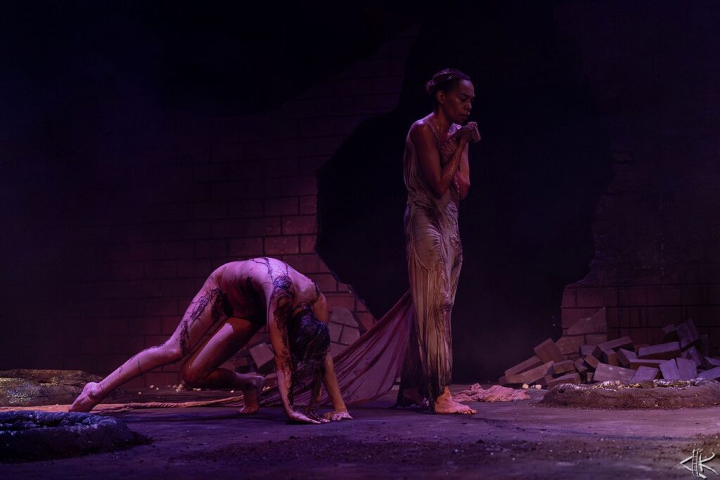 Yπάρχει μια στιγμή στην παράσταση (στην έναρξή μου) όπου αυτό γίνεται απολύτως σαφές. Η σιωπηλή είσοδός μου επί σκηνής, κατεβαίνοντας τις σκάλες, είναι δομημένη τελετουργικά. Πριν αρθρωθεί η πρώτη λέξη, το σώμα έχει ήδη καταλάβει. Προχωράει αδύναμο και δυνατό σαν να φέρει τις ρωγμές όλου του κόσμου. Εκείνη τη στιγμή νιώθω ταυτόχρονα παρούσα και απούσα σε ένα μεταίχμιο όπου η μνήμη δεν έχει ακόμα γίνει σκέψη, αλλά ήδη κατοικεί στο σώμα μου.