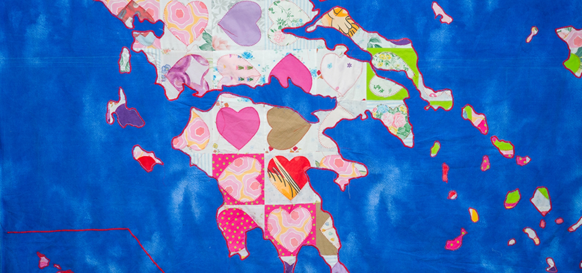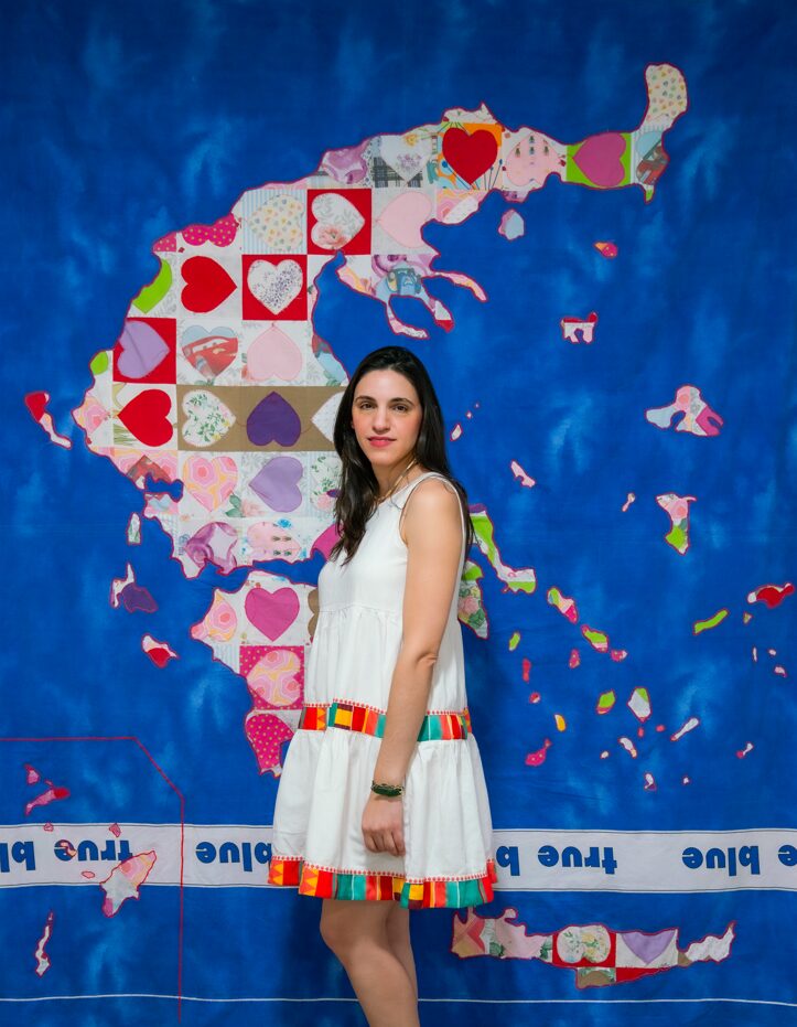 Το έργο “True Blue” με τον χάρτη της Ελλάδας κατασκευασμένο από σεντόνια που έχουν δωρίσει γυναίκες στην καλλιτέχνιδα, με την προϋπόθεση ότι έχουν ξεκουραστεί πάνω σε αυτά και έχουν ονειρευτεί έναν κόσμο ισότητας και δικαιοσύνης.