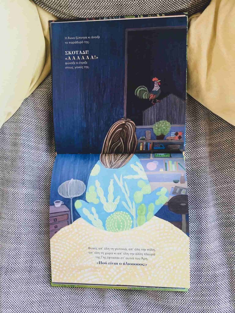 Μια έξυπνη ιστορία για τον κύκλο της μέρας και της νύχτας και για την αξία τού να μοιραζόμαστε, να συμπάσχουμε, και να αντιλαμβανόμαστε πως αποτελούμε ένα μικρό μόνο μέρος ενός οικουμενικού συστήματος, που η ισορροπία του εξαρτάται από κάθε μικρή μας κίνηση. Η συγγραφέας Ζηνοβία Βασιλειάδη είναι ψυχολόγος-ψυχοθεραπεύτρια και με αυτή την ιδιότητά της στοχεύει στην σφοδρότητα των παράλογων συχνά παιδικών επιθυμιών που εκτοπίζουν κάθε λογική. Οι εικόνες της Μαρίνας Δημοπούλου, συνθέτουν ένα ήσυχο και όμορφο εικαστικό σύμπαν – ενδιαφέρον έχουν οι κάθετες εμβόλιμες σελίδες του βιβλίου.