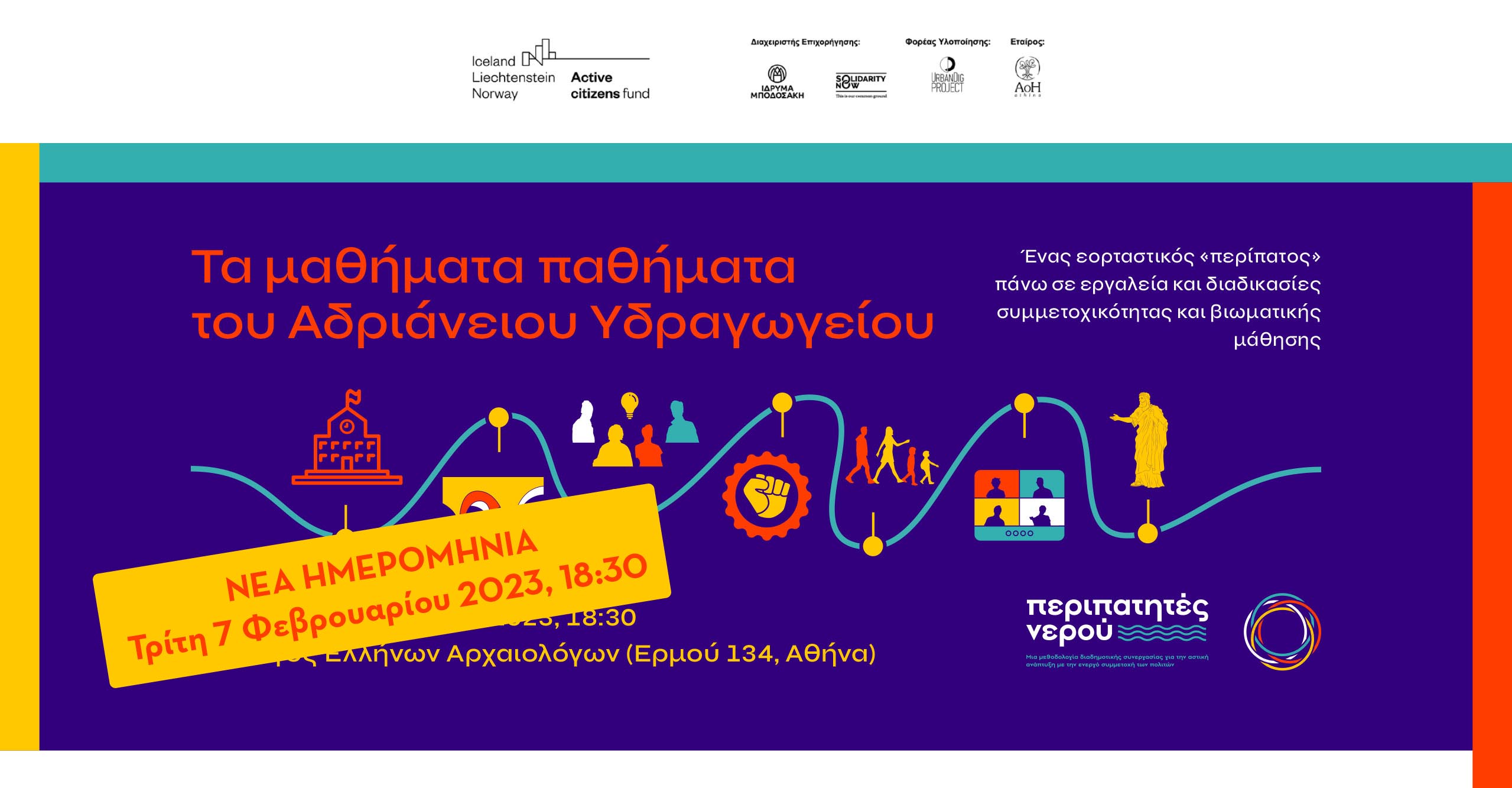 - Εισαγωγή για το Αδριάνειο Υδραγωγείο από τον κ. Νίκο Μαμάση, Καθηγητή στον Τομέα Υδατικών Πόρων και Περιβάλλοντος της Σχολής Πολιτικών Μηχανικών ΕΜΠ, παρουσίαση Περιπατητών Νερού, μεθοδολογίας και αποτελεσμάτων του προγράμματος από την ομάδα έργου και αναφορά στο πρόγραμμα Active Citizens Fund από την κα Τζένη Λαζάρου εκπρόσωπο του Ιδρύματος Μποδοσάκη.