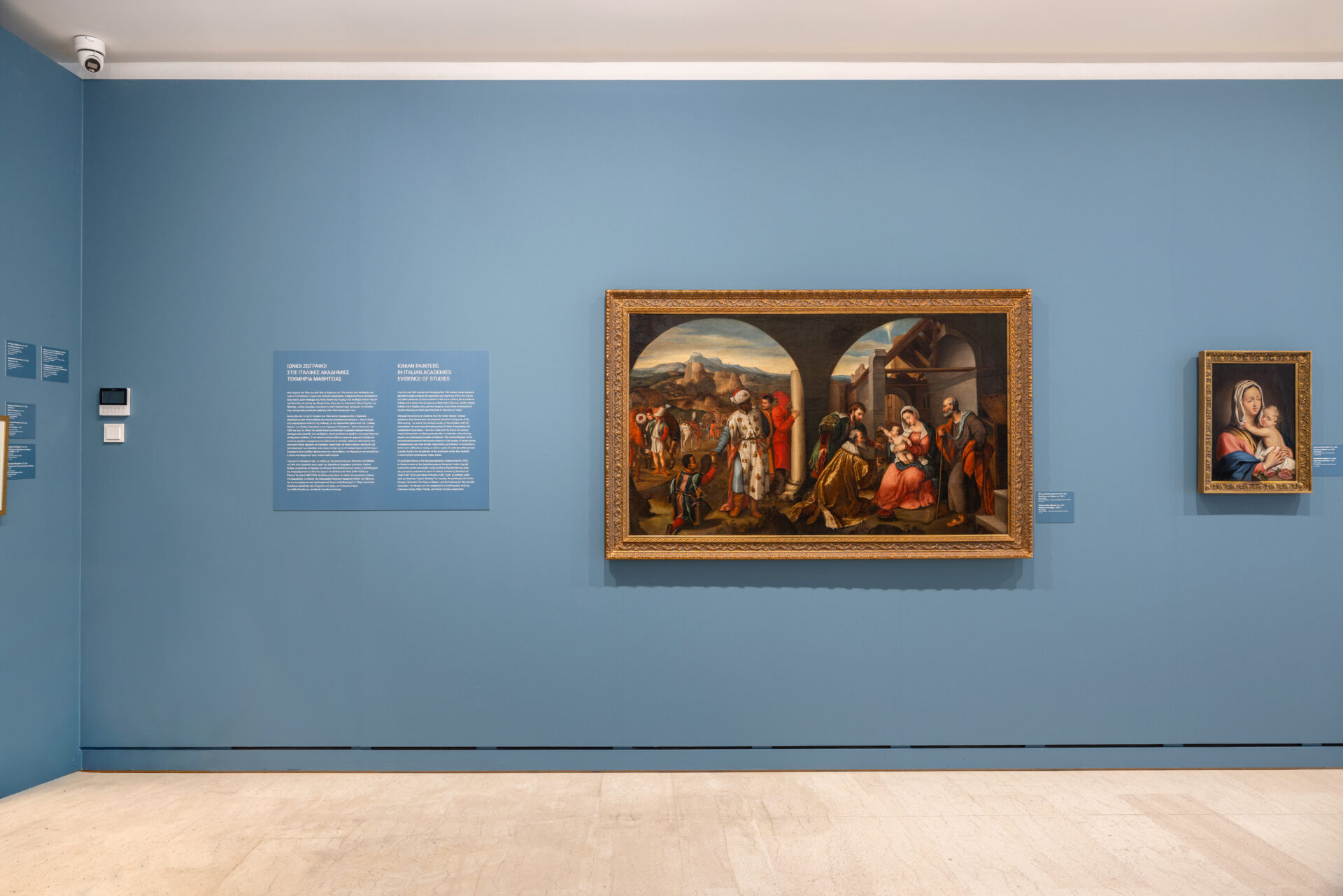 Ένα από τα σημεία ήταν η διασύνδεση με την ιταλική χερσόνησο ή όπως έχουμε συνηθίσει να λέμε με τη Δύση. Θέλαμε δηλαδή να αναδείξουμε την ξεχωριστή παραγωγή που λαμβάνει χώρα στο Ιόνιο από την ύστερη Βενετοκρατία μέχρι τις πρώτες δεκαετίες μετά την Ένωση και πώς έχουμε εκεί μία πρώτη παραγωγή που μπορεί να έχει διαμορφωτικά χαρακτηριστικά και για τη μετέπειτα καλλιτεχνική παραγωγή στην Ελλάδα, αλλά και την Ανατολική Μεσόγειο. Έτσι η επιλογή έγινε με αρχή τον 18ο αιώνα από τον θεωρούμενο ιδρυτή της νεοελληνικής ζωγραφικής, τον Παναγιώτη Δοξαρά και ξεκινάει με τη θεωρητική, με την ιδρυτική πράξη, που είναι το χειρόγραφο “Τέχνη Ζωγραφίας (1724)”. Και “ξεδιπλώνεται” το πώς παράλληλα από τη μια τα έργα και από την άλλη τα τεκμήρια στον 18ο αιώνα δείχνουν αυτή τη διάβρωση ή την αφομοίωση καλλιτεχνικών τρόπων από την ιταλική χερσόνησο».