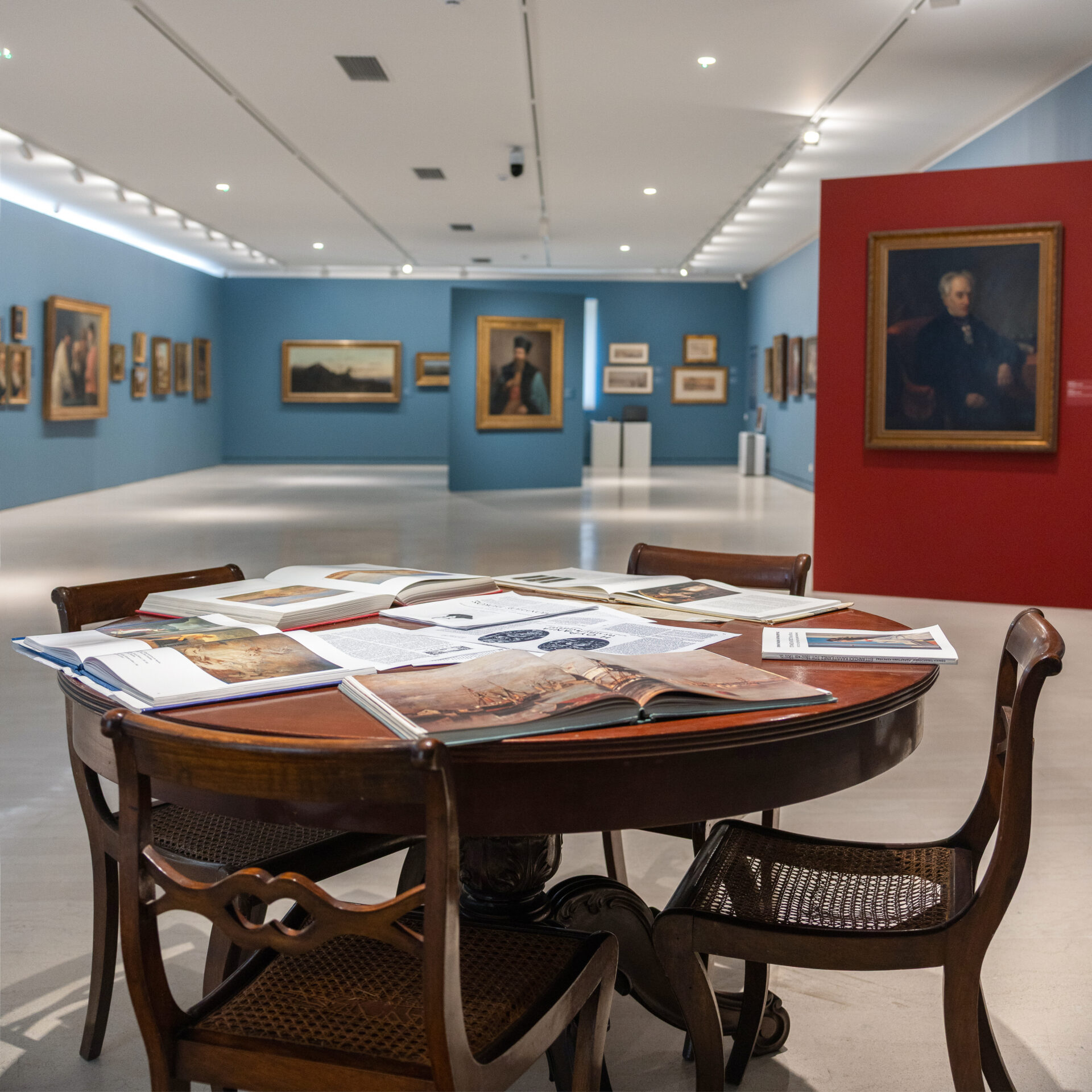 Στο τέλος της έκθεσης υπάρχει ένα τραπέζι γεμάτο με σχετικά βιβλία, σημαντικά άρθρα που ολοκληρώνουν τα ιστορικά κομμάτια και την περίοδο που καλύπτει η έκθεση «Η Ζωγραφική στο Ιόνιο: 18ος – 19ος αιώνας» από τη ζωγραφική δηλαδή, της ύστερης βενετικής κυριαρχίας στο Ιόνιο έως τις τελευταίες δεκαετίες του 19ου αιώνα. Δίπλα του ο καναπές του Γεωργίου Ράλλη, είναι ένα σημείο-κομμάτι που φέρνει κάτι από φιλολογικό σαλόνι.