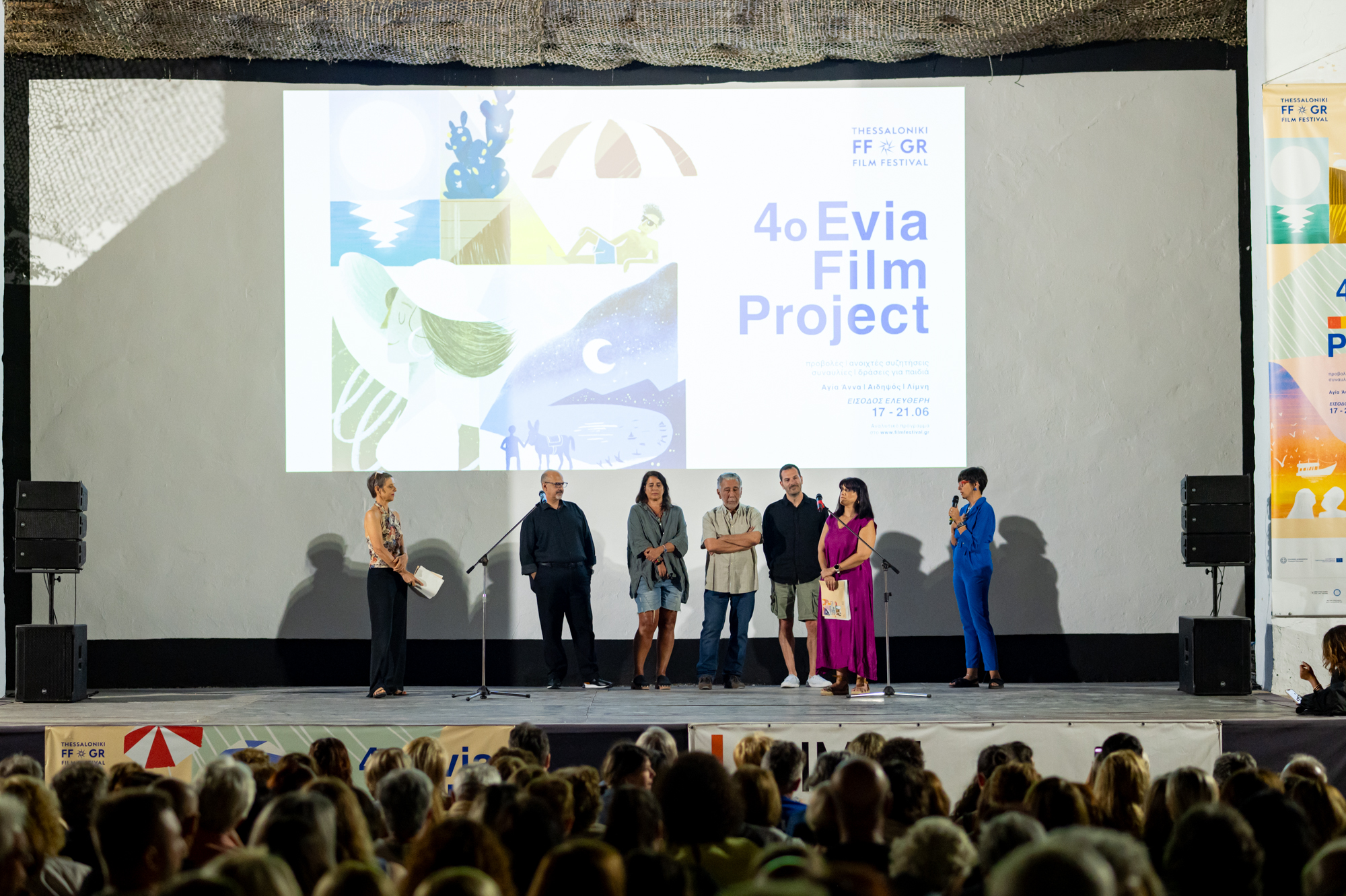 Στη συνέχεια, κάλεσε στη σκηνή τους συντελεστές της ταινίας, τη σεναριογράφο και Αντιπρόεδρο του Διοικητικού Συμβουλίου του Φεστιβάλ Κινηματογράφου Θεσσαλονίκης Κατερίνα Μπέη, τον παραγωγό Διονύση Σαμιώτη, τον Executive Director Εταιρικής Επικοινωνίας, Βιώσιμης Ανάπτυξης και CEO Cosmote TV Production Δημήτρη Μιχαλάκη και τον σκηνοθέτη και στενό φίλο του Φεστιβάλ Γιώργο Τσεμπερόπουλο, τους οποίους ευχαρίστησε για την παραχώρηση της ταινίας στο 4ο Evia Film Project.
