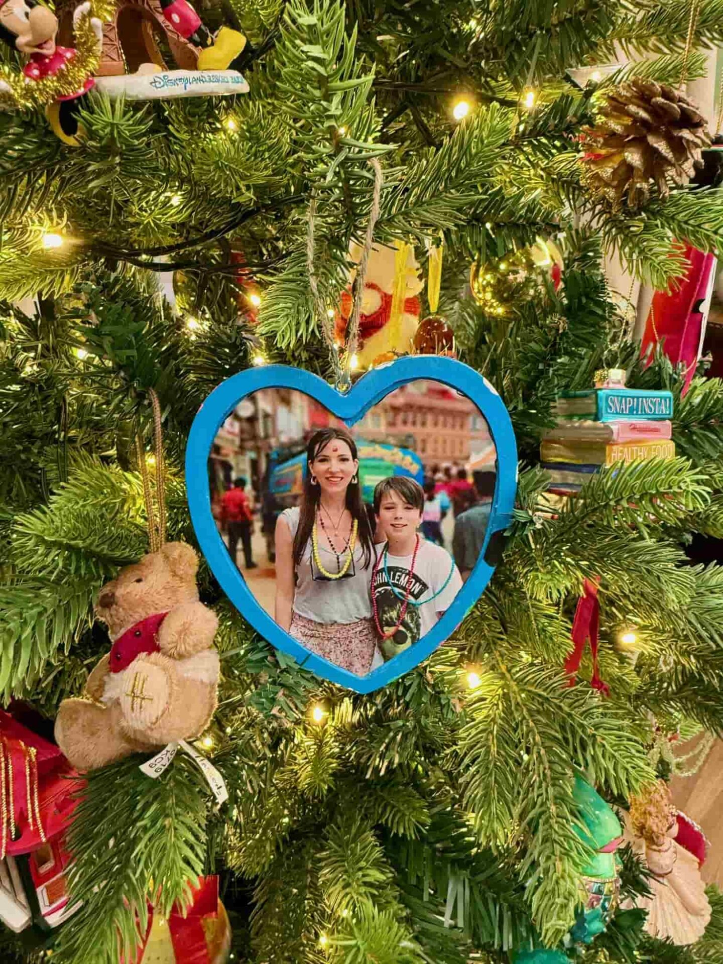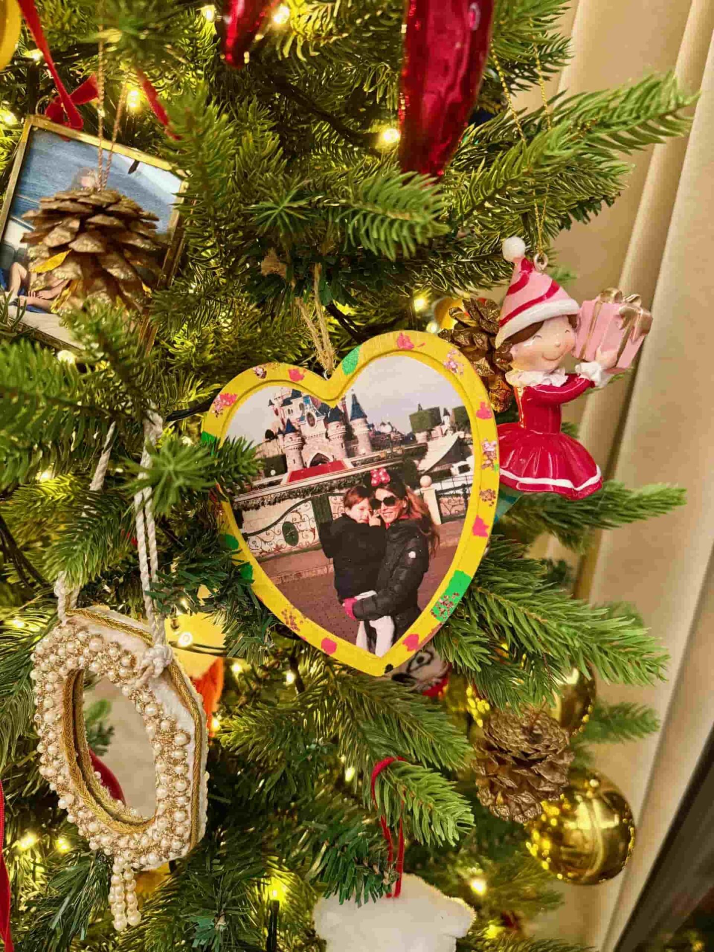 Ανάμεσά τους, έχω κρεμάσει και φωτογραφίες που έχω μετατρέψει σε στολίδια από τα ταξίδια μας. Επίσης φωτογραφίες του Καρόλου μέχρι την αποφοίτησή του, της μαμάς μου, της γιαγιάς μου, της γάτας μας, της Ολυμπίας της γλυκιάς μου βαφτιστήρας. Κάθε χρόνο προστίθενται νέες αναμνήσεις και σχεδόν πια δεν υπάρχει χώρος για τυπικά στολίδια.