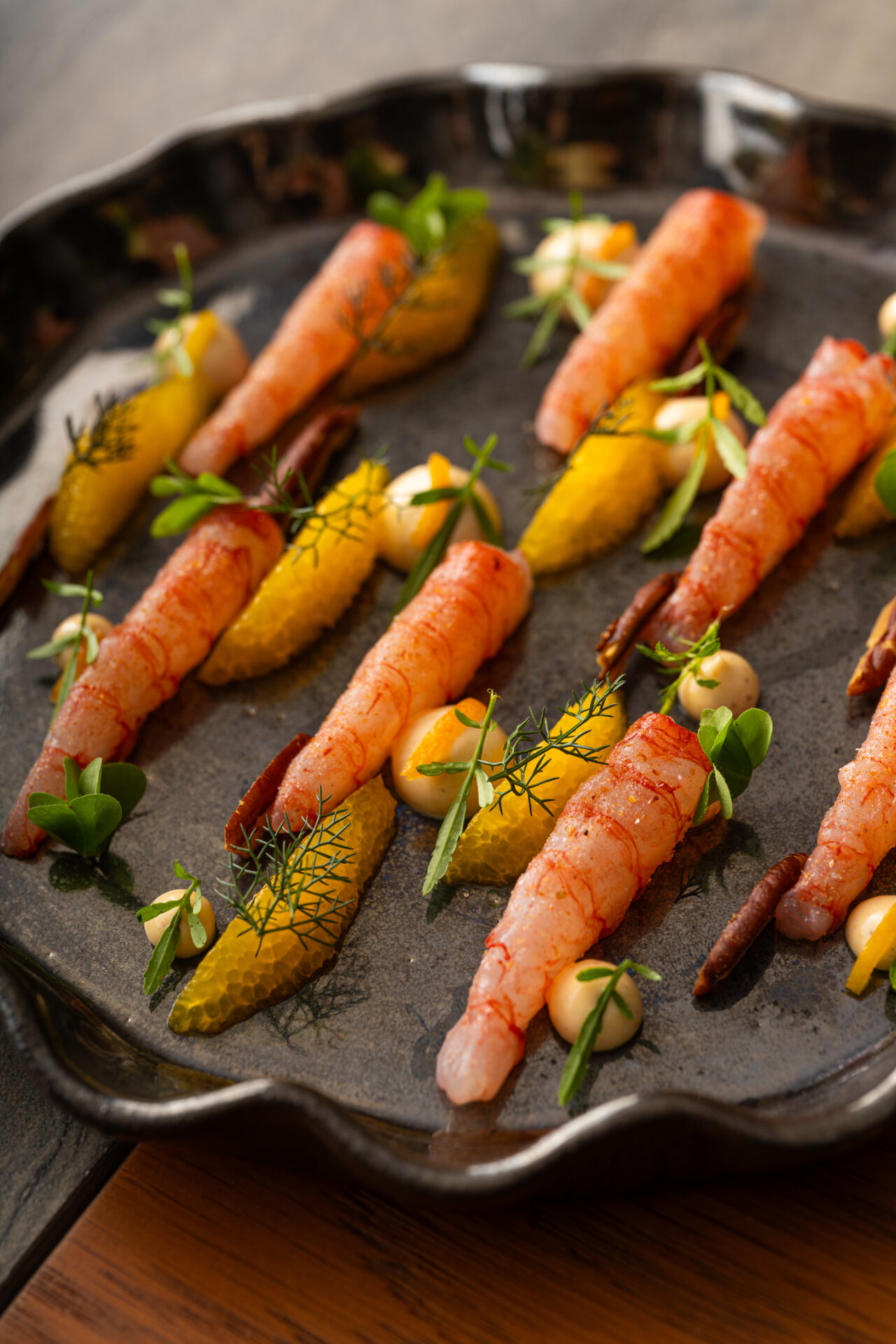 Η ανοιχτή κουζίνα φέρνει τη διαδικασία της δημιουργίας στο προσκήνιο, μετατρέποντας το μαγείρεμα σε μέρος της εμπειρίας. Τα πιάτα σερβίρονται σε custom κεραμικά του MudLab, σχεδιασμένα ειδικά για το Amphibian, ενώ τη συνολική εμπειρία συμπληρώνουν γαστρονομικά cocktails και μια σύγχρονη λίστα κρασιών που κινείται ελεύθερα ανάμεσα σε διαφορετικές εκφράσεις του terroir, από καθαρές και ακριβείς οινοποιήσεις έως πιο ζωντανές, αυθόρμητες ζυμώσεις.