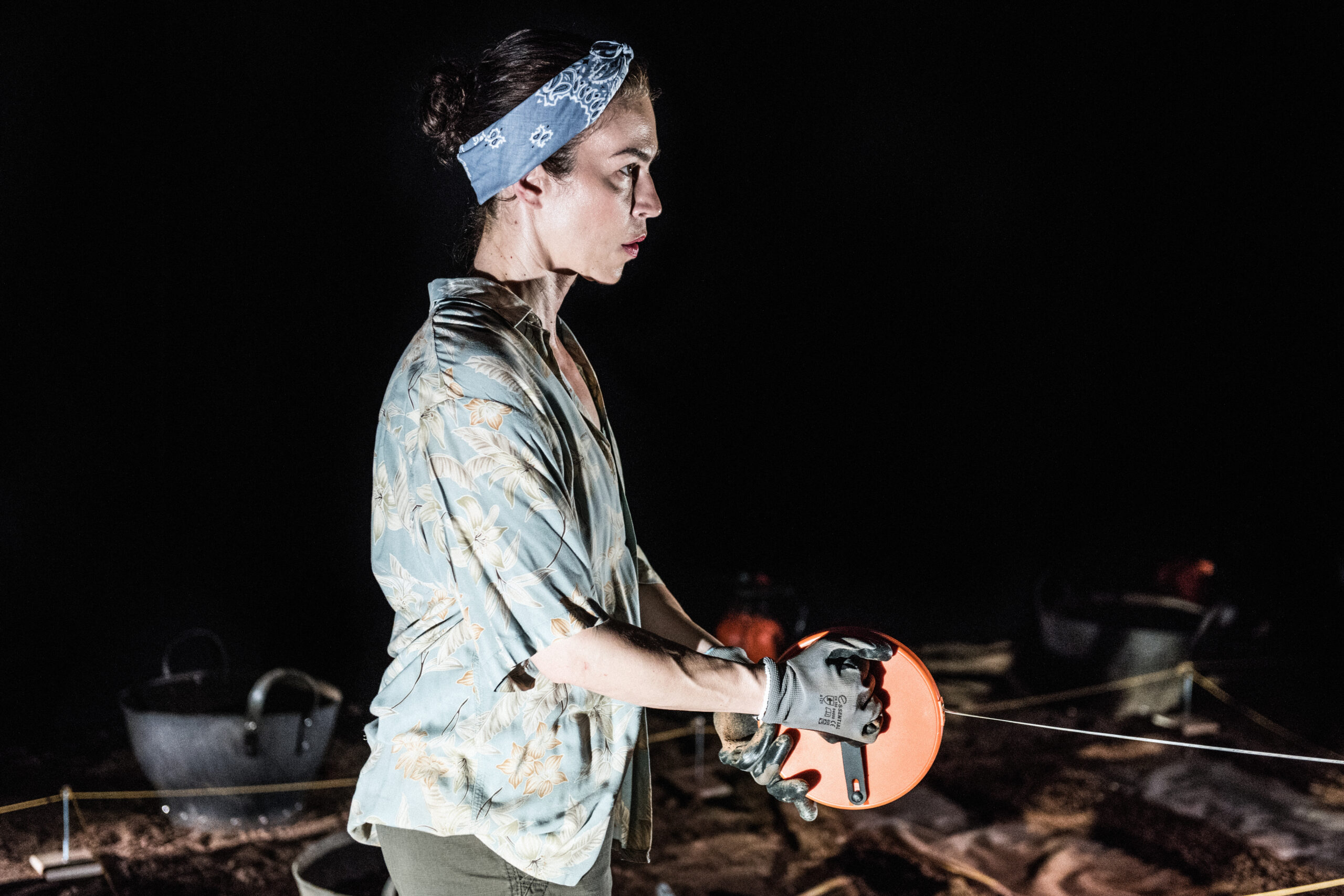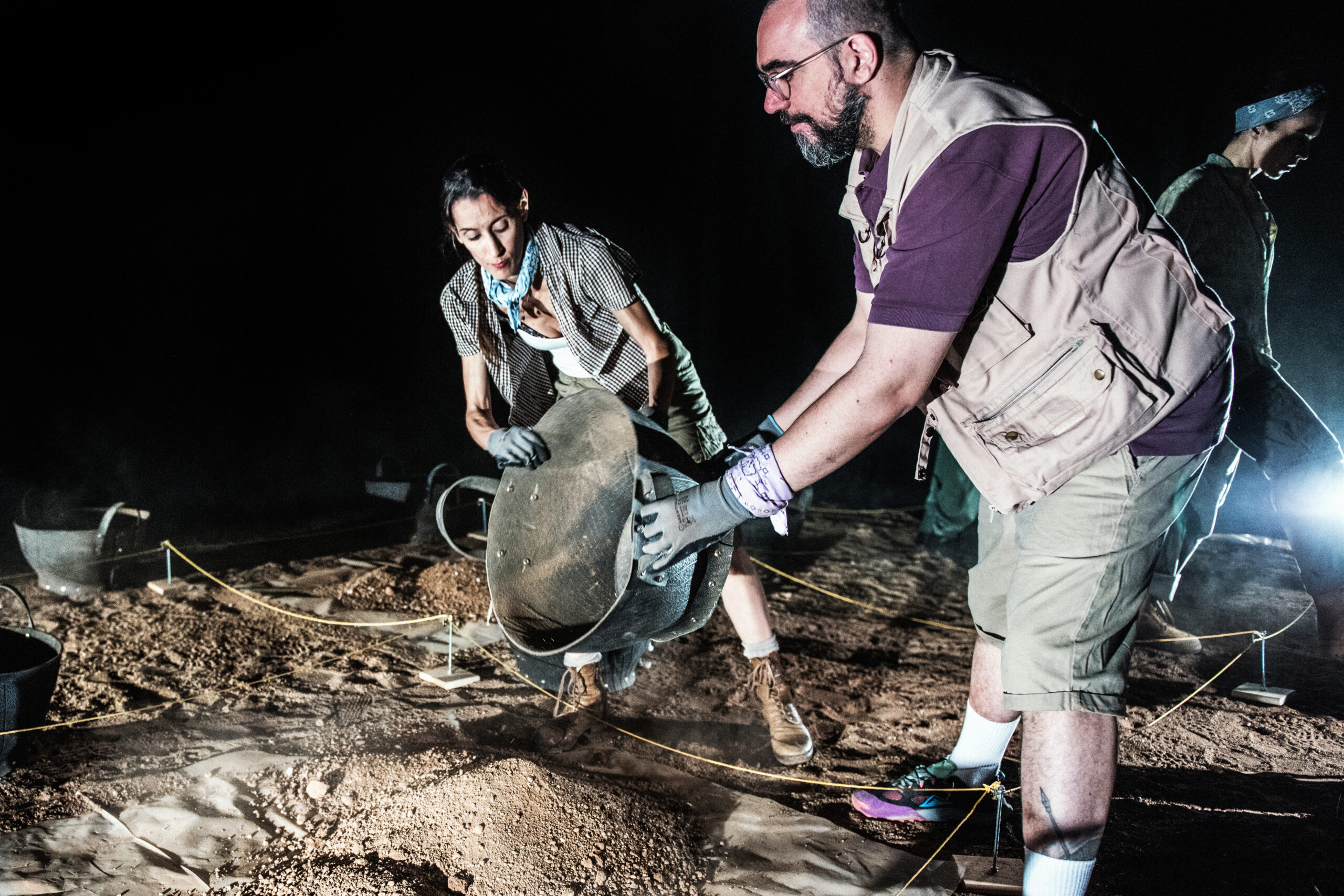 Στη σκηνή στήνεται μια παράδοξη, υπαρξιακή ανασκαφή που τα ευρήματά της δεν είναι, αυτή τη φορά, αγγεία ή αρχιτεκτονήματα, αλλά θεατρικοί στίχοι, λόγια αρχαίων ηθοποιών, σπασμένα σε μικρά κομμάτια. Πέντε ερμηνευτές/αρχαιολόγοι, εφοδιασμένοι με σκαλιδάκια, πινελάκια, κόσκινα και τριγωνάκια, σκάβουν κάτω από τον ήλιο, ακολουθώντας τη σχεδόν τελετουργική διαδικασία μιας αρχαιολογικής ανασκαφής, όπως αυτή εξελίσσεται κατά τη διάρκεια μιας ημέρας. Και μέσα από τα σκάμματά τους ξεπηδούν στιγμιότυπα αρχαίων παραστάσεων και λεπτομέρειες της καθημερινής ζωής των θεάτρων, όπου θα πραγματοποιηθεί το έργο.